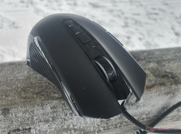 RGB照明的Ranger M910游戏鼠标完全由哑光黑色塑料制成,具有良好的手感和质量。它适用于右手和左手的用户。所有九个按钮都能很好地坐在箱子里,包括轻度橡胶的鼠标滚轮。只有侧面的塑料看起来有点廉价。还有一些边缘,但它们并没有给我们带来任何问题。