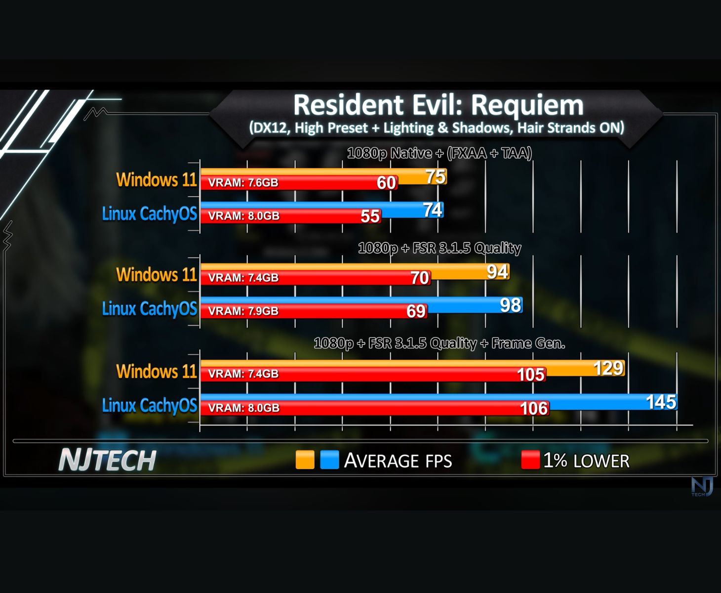 生化危机 Requiem》基准测试表明,Linux 系统的帧生成速度为 145 FPS,而 Windows 11 系统为 129 FPS。
