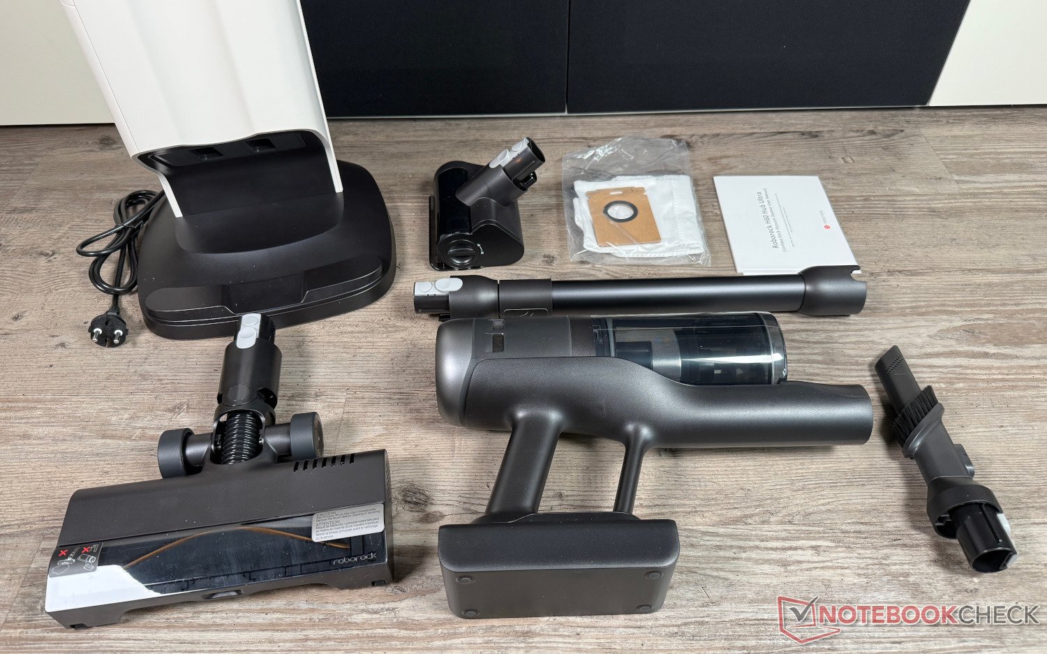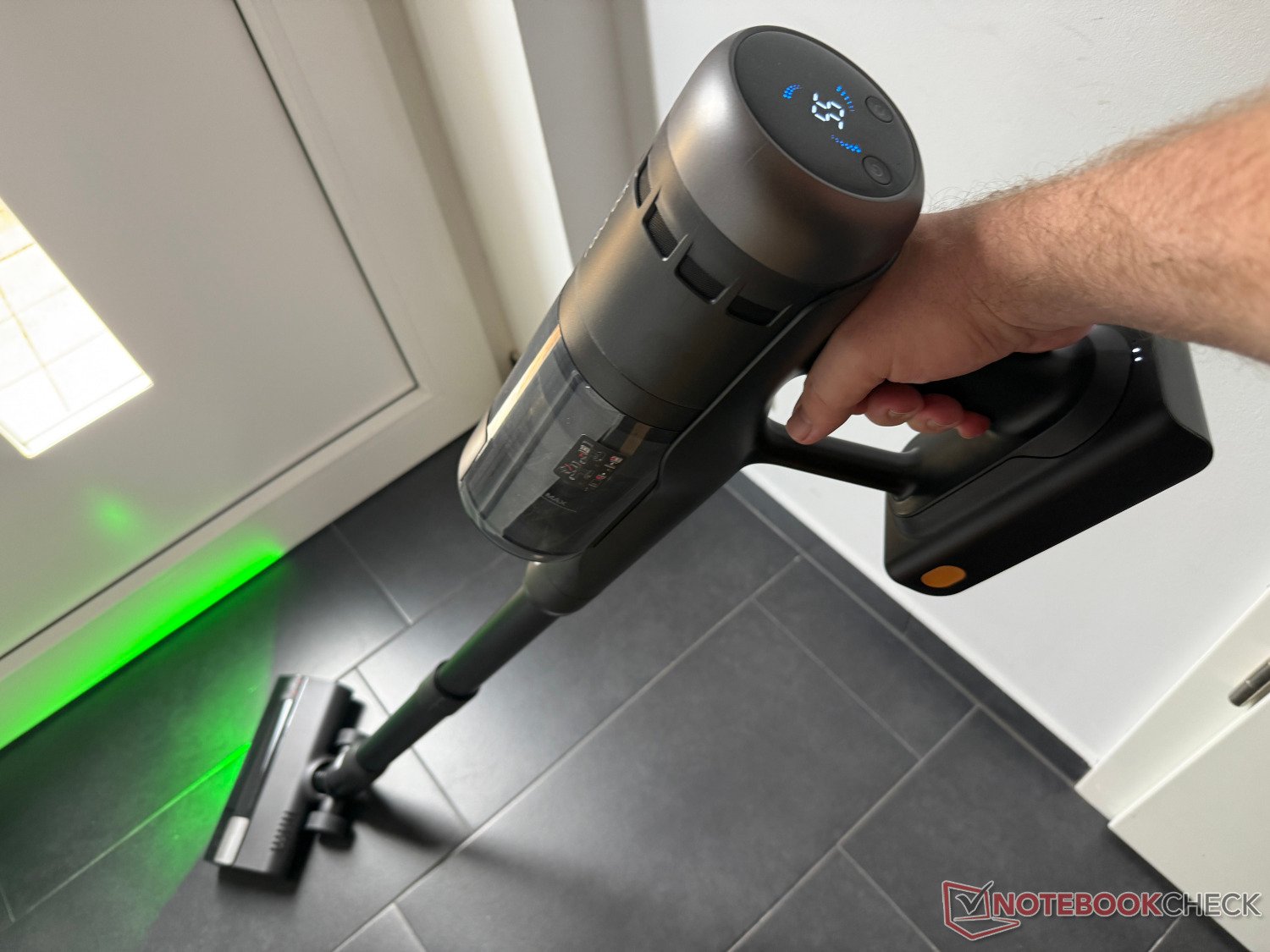 带伸缩管和地板刷的无绳真空吸尘器重量约为 3 千克,包括可更换电池(带电池的电机组约为 1.8 千克)。市场上有更轻但也有更重的设备。与大多数同类产品一样,Roborock H60 Hub Ultra 的重心位于电机和电池所在的上部区域。这在长时间使用时会很明显。