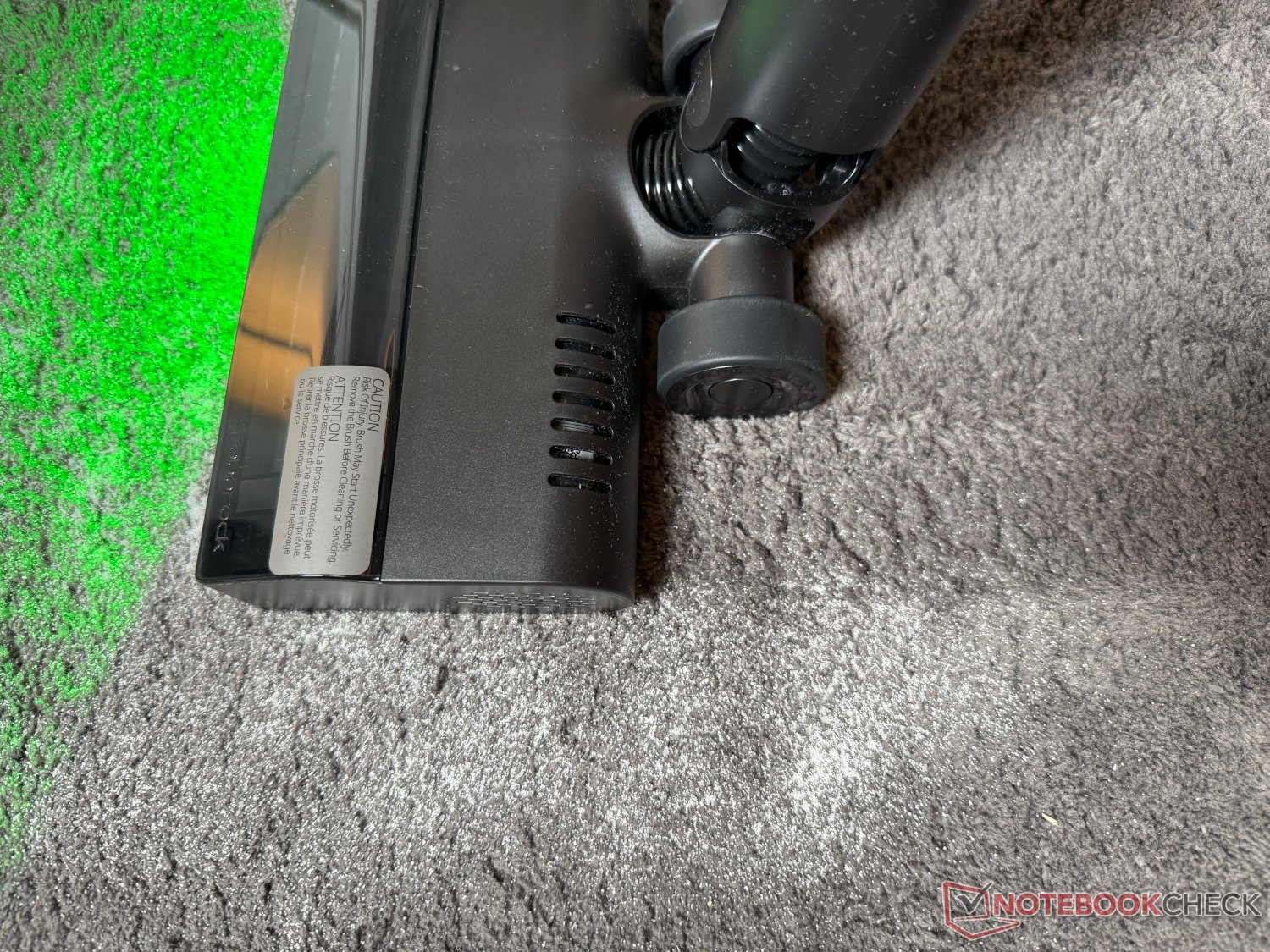 在测试中,Roborock 的 H60 Hub Ultra 在地毯上的表现也不错,即使是绒毛较长的地毯,也能清除大量污垢,但不是全部。不过,在脏污严重的区域(例如有细沙的区域)经过几次清洁后,大部分污垢都被吸走了。毛发几乎不会缠绕在滚筒上,因此一般不需要人工干预。地刷上的绿灯是一项实用功能。这样可以看到更多的污垢。