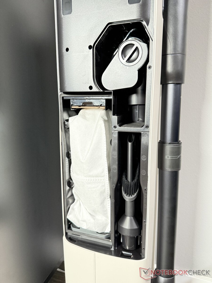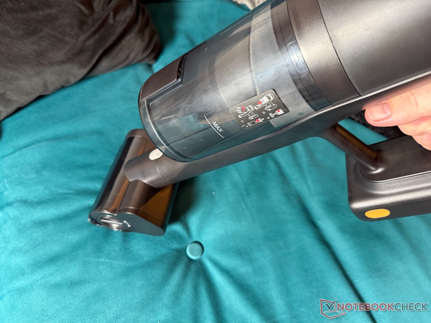 吸尘过程只需几秒钟,声音约为 75 分贝(从 1 米远处测量)。在我们的测试过程中,虽然可能会残留一些灰尘,但集尘盒一般都能很好地清空。为此目的(以及清洁过滤器),也可以取出集尘盒并手动清洁。