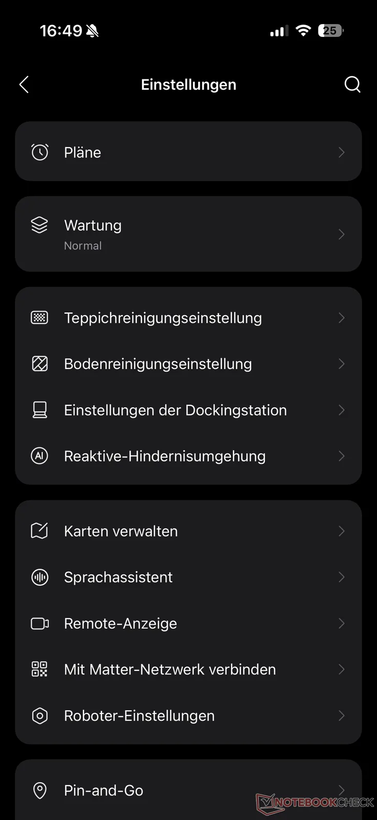 清洁设置也是如此。根据您的选择,机器人可以先吸尘后拖地,也可以同时吸尘和拖地,或者只吸尘或拖地。吸力可以分四级调节,水流量甚至可以在 30 小时内调节。此外还有其他选项,如清洁次数和路线选择的彻底性。