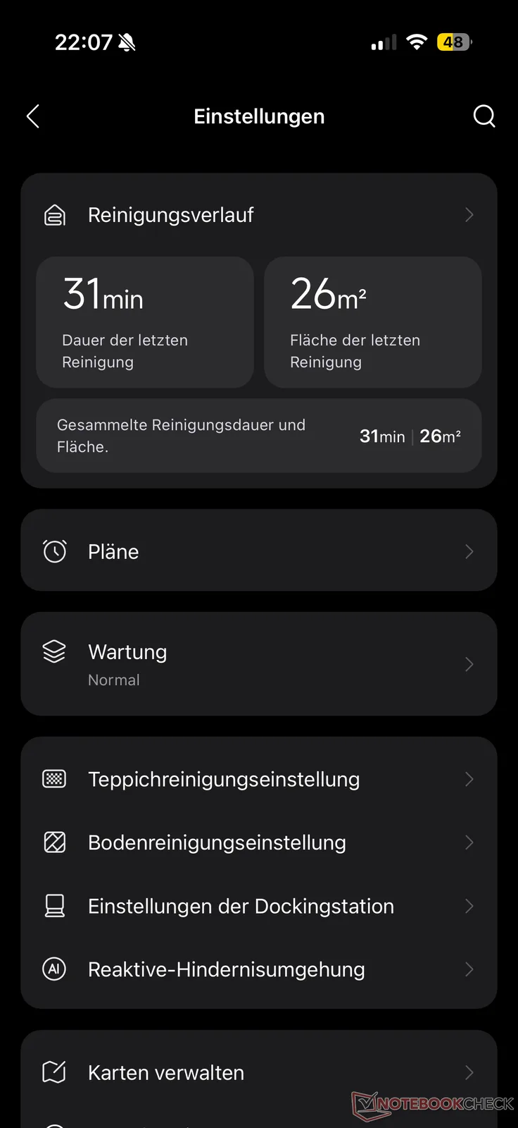 像往常一样,清洁设置有很多选项,我们已经从 Qrevo Curv 2 Pro和其他 Roborock 型号中已经了解到的。不过,我们确实错过了只擦拭模式。我们认为,对于一款注重拖地性能的机器人真空吸尘器来说,没有提供这种模式是合理的。相反,除了单独调节和带有自动 AI 调节功能的 "AI 智能计划 "外,Qrevo 还可以选择 "先吸尘,再拖地"、"先吸尘,再拖地 "和 "先吸尘"。吸力可分四级调节,拖地湿度可分 30 级调节。