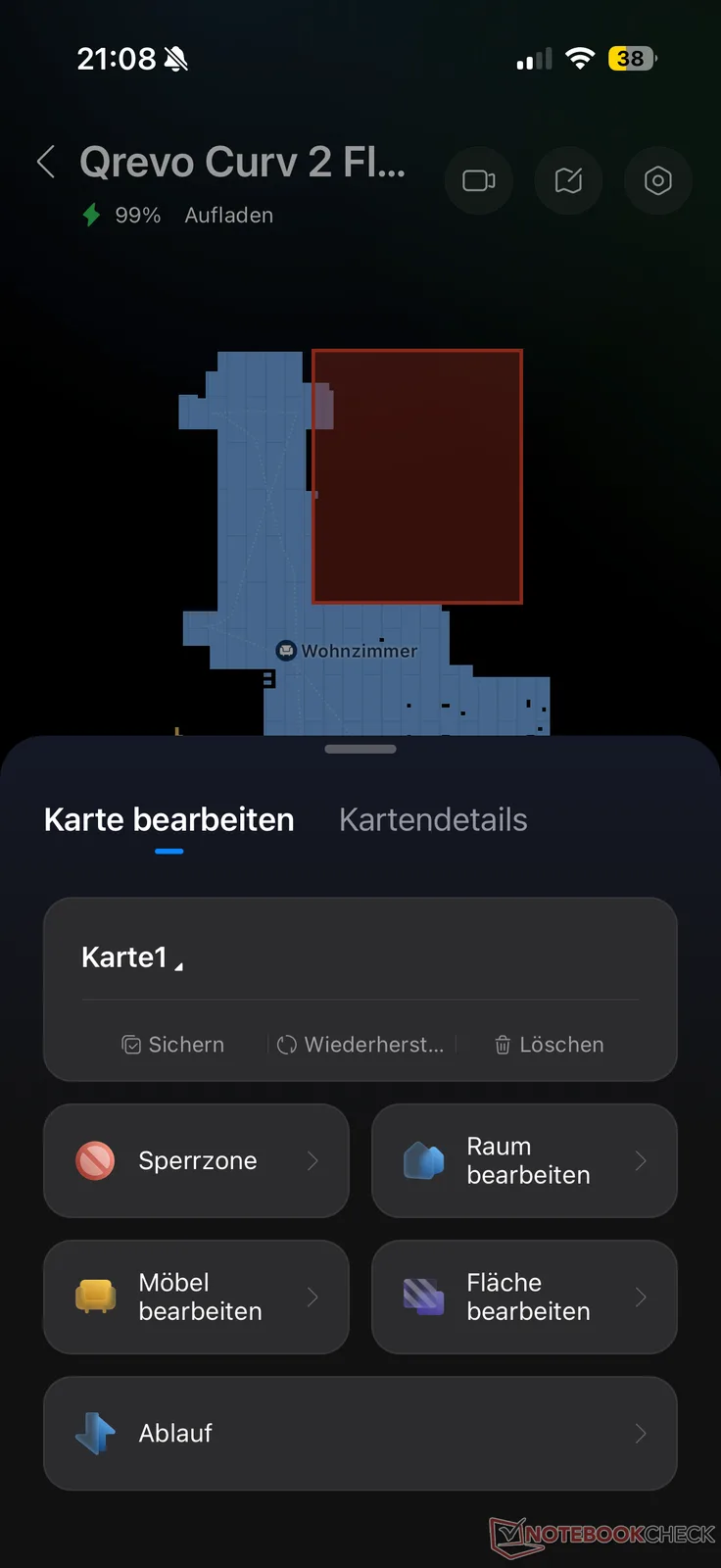 在导航方面,Qrevo Curv 2 Flow 给人留下了信心十足的整体印象,该制造商的许多其他激光雷达型号也是如此。它在测试环境中尽可能系统地导航,并在合理的时间内(尽可能)覆盖了整个区域。不过,由于它的高度接近 12 厘米,而且激光塔不可伸缩,因此与许多其他型号相比,它能清理的柜子要少得多。因此,房间的覆盖范围最终并不完美,但已经不错了。