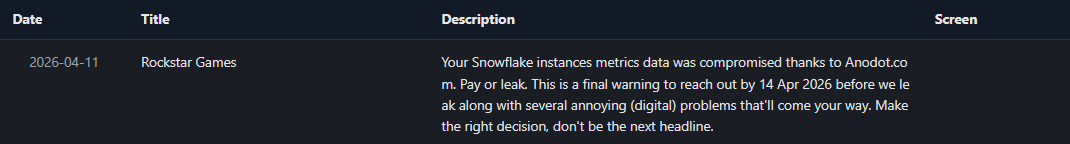 据RansomLook.io和CyberSec Guru称,攻击者并没有直接入侵 Rockstar 的外围设备。相反,据称他们利用了第三方云成本监控平台 Anodot 的自动集成。该组织声称,他们通过从 Anodot 获取身份验证令牌,进入了 Rockstar 的 Snowflake 环境(该公司使用该环境存储和管理分析数据和玩家遥测数据等)。利用这种方法,攻击者可以通过使用长期有效的合法服务令牌绕过标准的多因素身份验证。在整个 2025 年末和 2026 年初,这类供应链漏洞似乎已成为 ShinyHunters 的主要攻击手段。