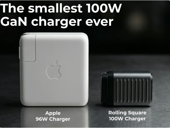 去年,Rolling Square 发布了 65W 氮化镓充电器号称是世界上最小的 65W 充电器。今年,它又推出了一款新的 100W 型号,具有更高的额定功率,也被宣传为世界上最小(100W)的充电器。