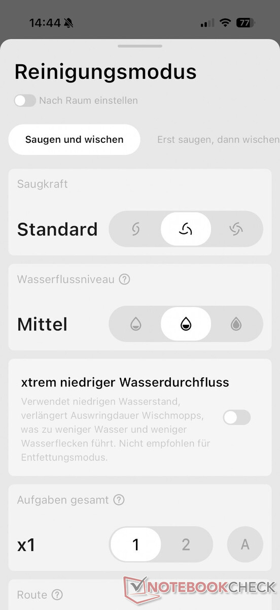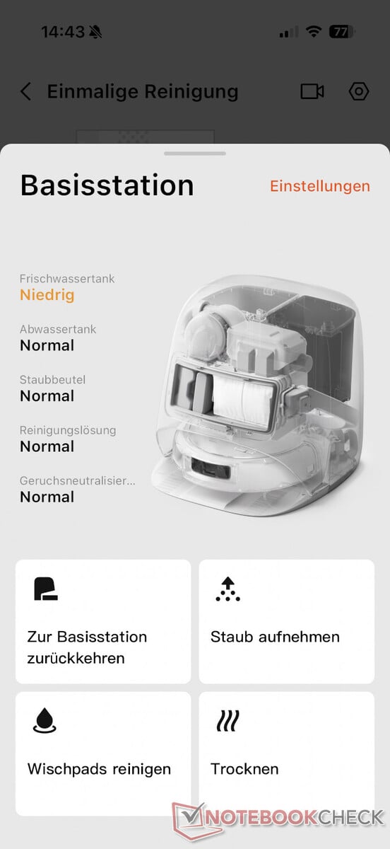 大疆创新(DJI)在该应用程序的设计上略有不同。不过,它仍然允许快速、轻松地访问所有功能,如清洁模式、设置和地图编辑与禁区。在站内工作和随后的清洁过程中,该应用程序始终会反馈当前的状态。这里没有什么可批评的。