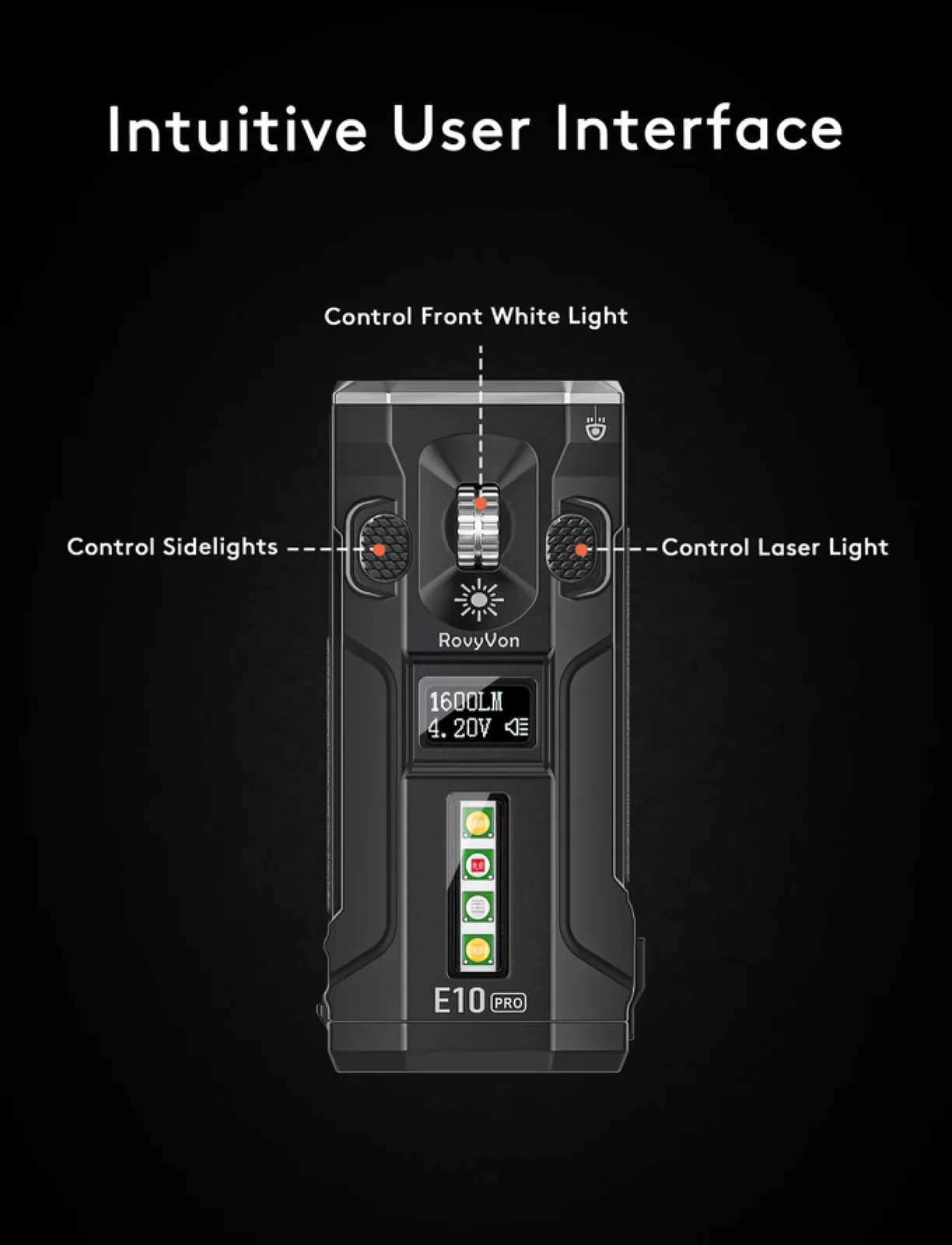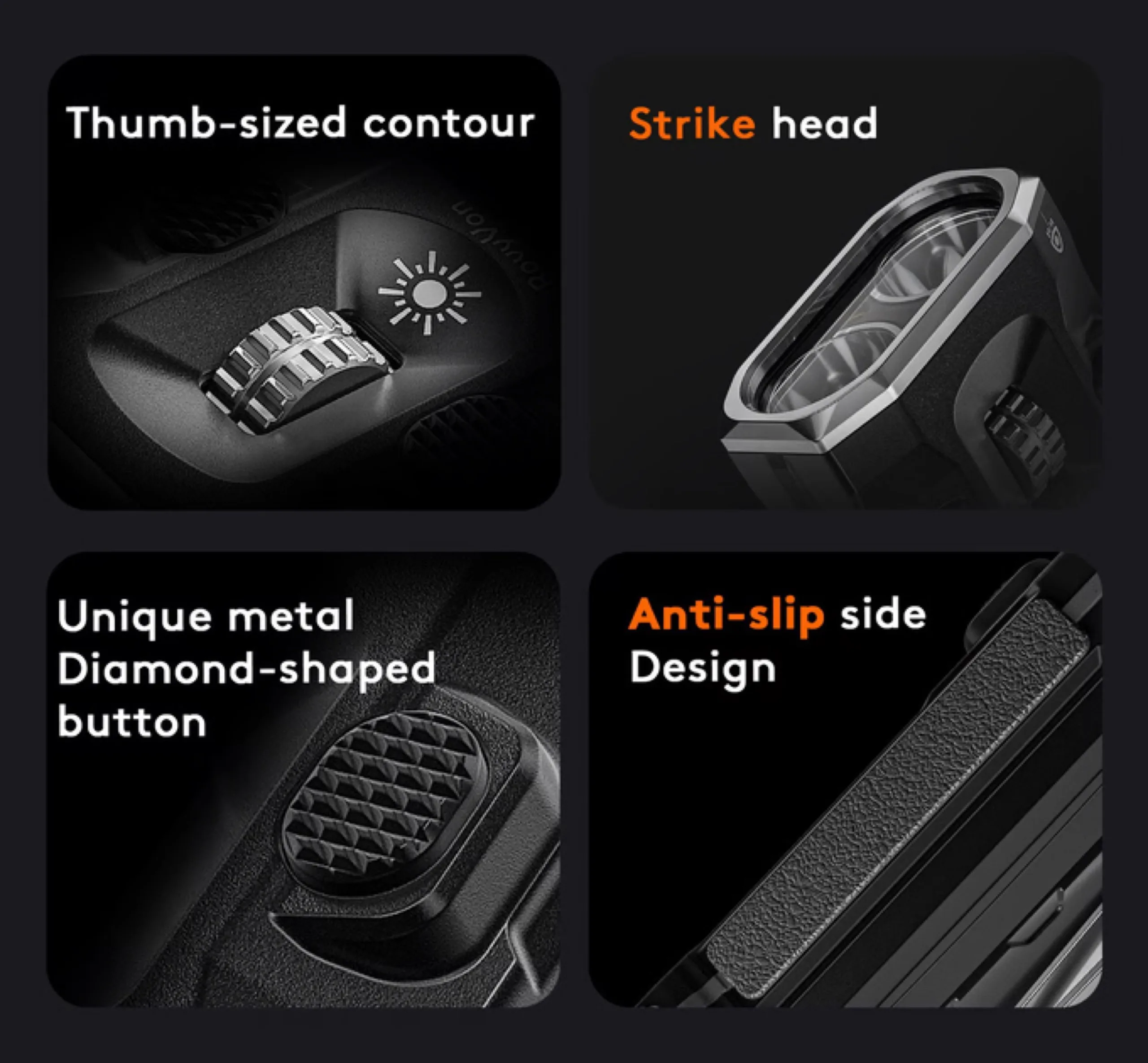 它的一个独特功能是滚轮,通过滚轮可以调节亮度;点击滚轮可以在不同模式之间切换。滚轮左侧的按钮可激活 "侧灯",它位于罗维旺 E10 Pro 的顶部,而同样的 E10 Max 则位于侧面。第二盏灯可用作暖白色阅读灯或红色求救信号灯。