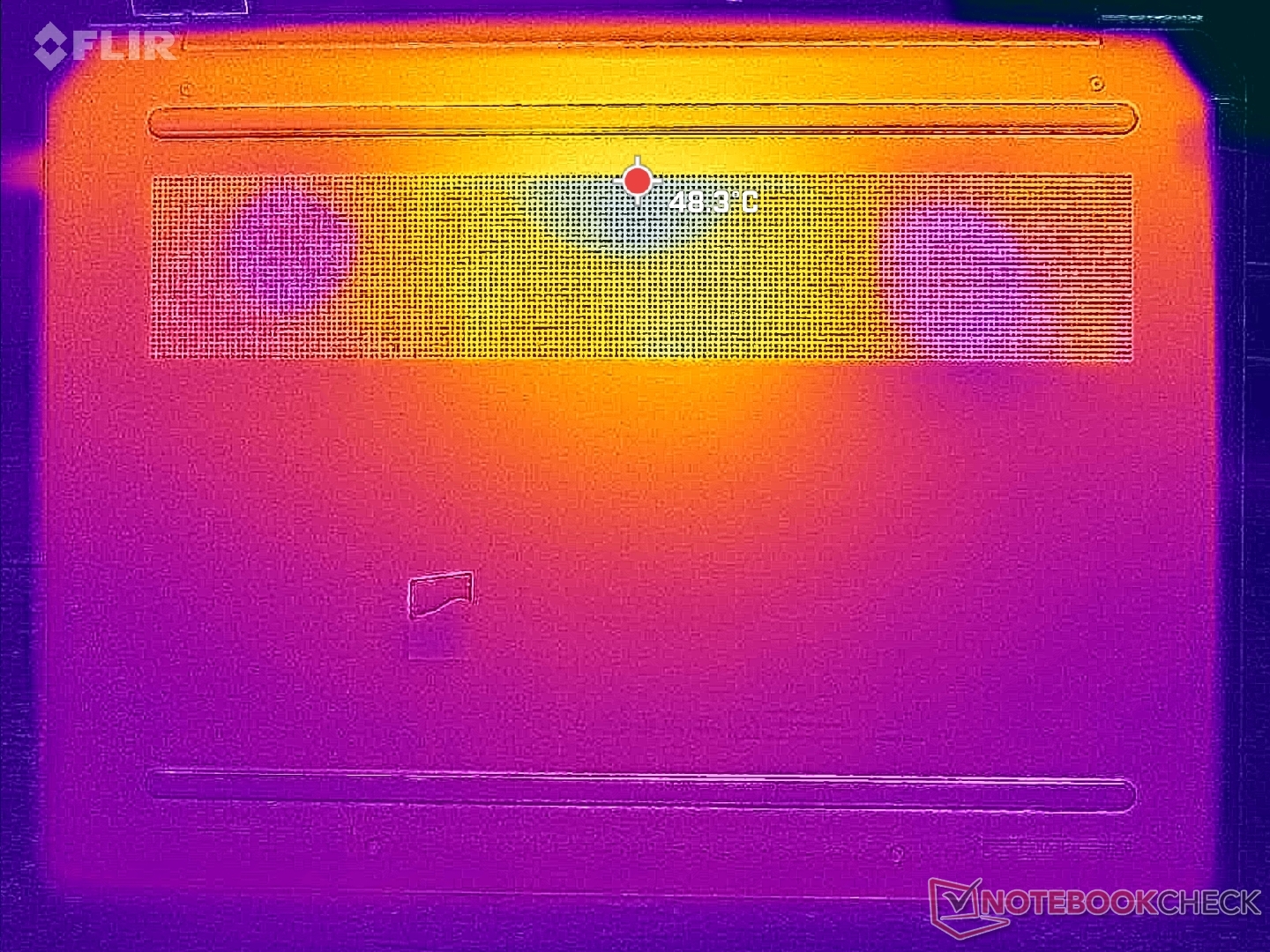 表面温度的发展是对称的,以反映内部的对称冷却解决方案。在运行游戏或其他苛刻负载时,键盘中心的热点温度可略高于 41 摄氏度,平均温度比 Spectre x360 14在类似条件下的平均温度更低。竞争产品 Yoga Pro 7 14 G9的最大表面温度与我们的 Omnibook 相似,只是热点更大。