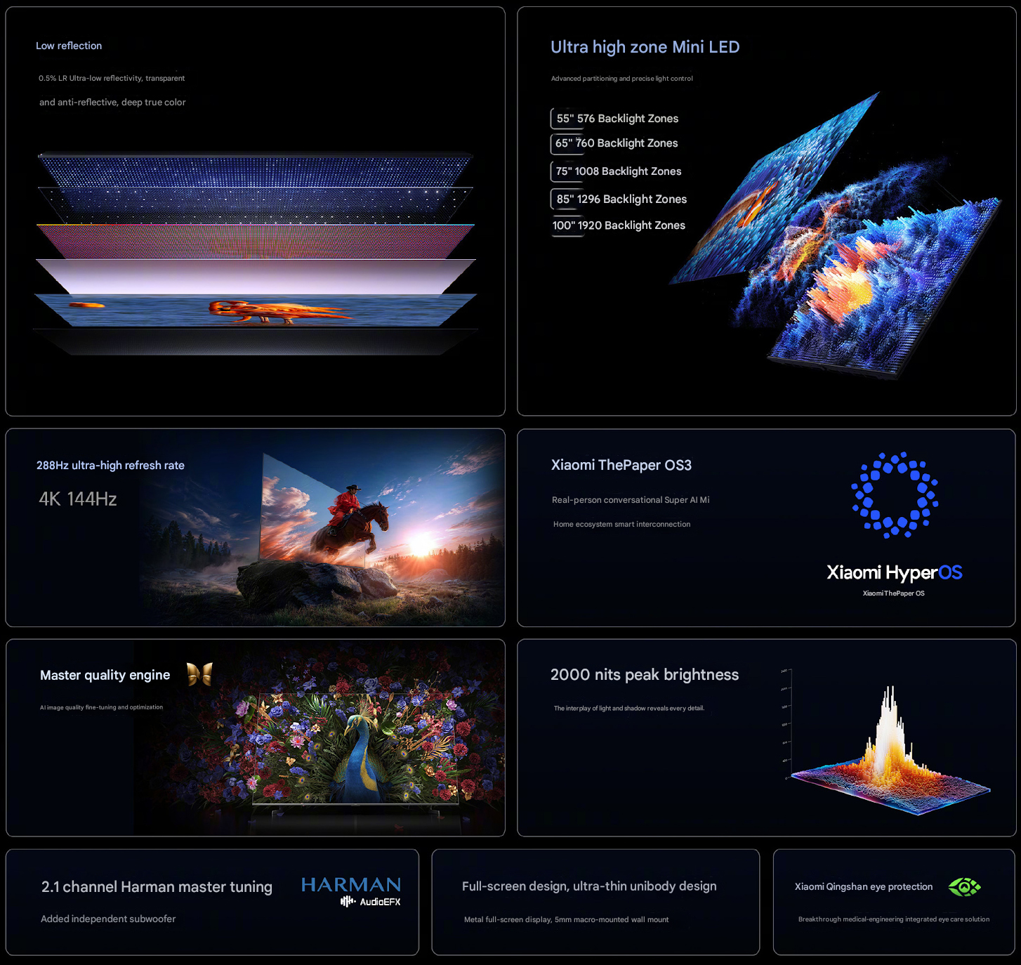 在这五个型号中,基本型号配备了 55 英寸面板,而顶级型号则配备了 100 英寸显示屏。最新系列 最近在欧盟正式上市而最近在欧盟正式上市的最新机型则达到了 98 英寸,面板也不尽相同。无论如何,以下是中国小米 S Mini LED 电视系列 2026 各款产品的上市价格: