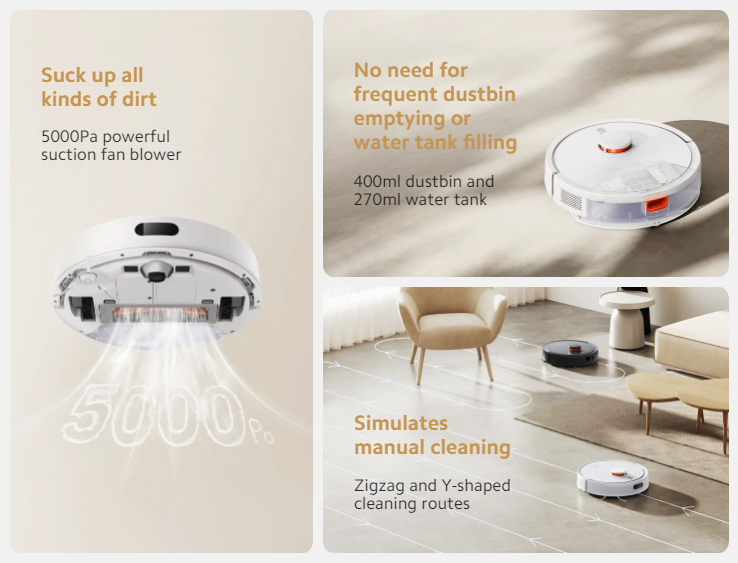 S20 可在三种动力模式下提供高达 5,000Pa 的吸力,配有中央滚刷和用于边缘清洁的较小边刷。由于内置了 400 毫升的集尘盒和 270 毫升的水箱,小米建议可以不经常清空或补充水。除此以外,据说集尘盒还采用了全新的阻隔设计,确保灰尘被阻隔在里面。利用 LDS 激光导航系统,机器人在清洁时可以以之字形或 Y 形模式移动。此外,传感器还能帮助它探测并避开宠物或鞋子等障碍物。