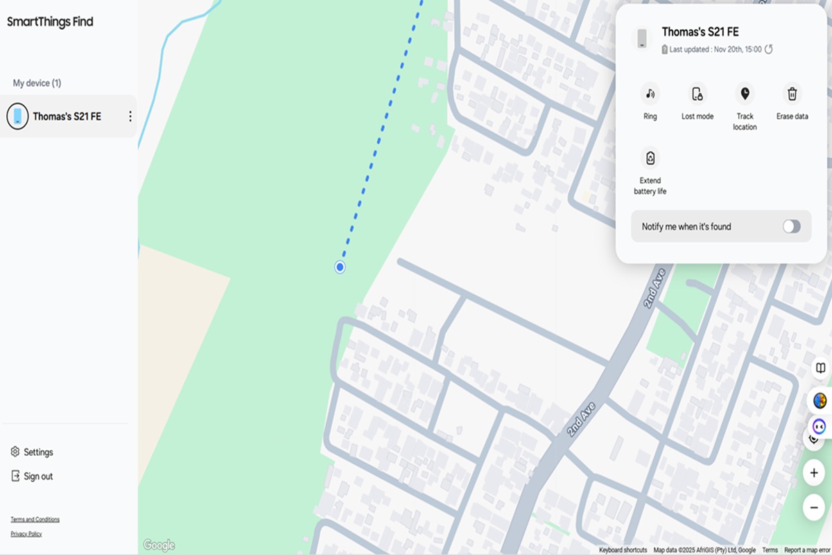 几分钟内,SmartThings Find 就开始报告高度准确的位置更新。该功能正是针对这种情况设计的:手机在连接性较弱的地区丢失或被盗。