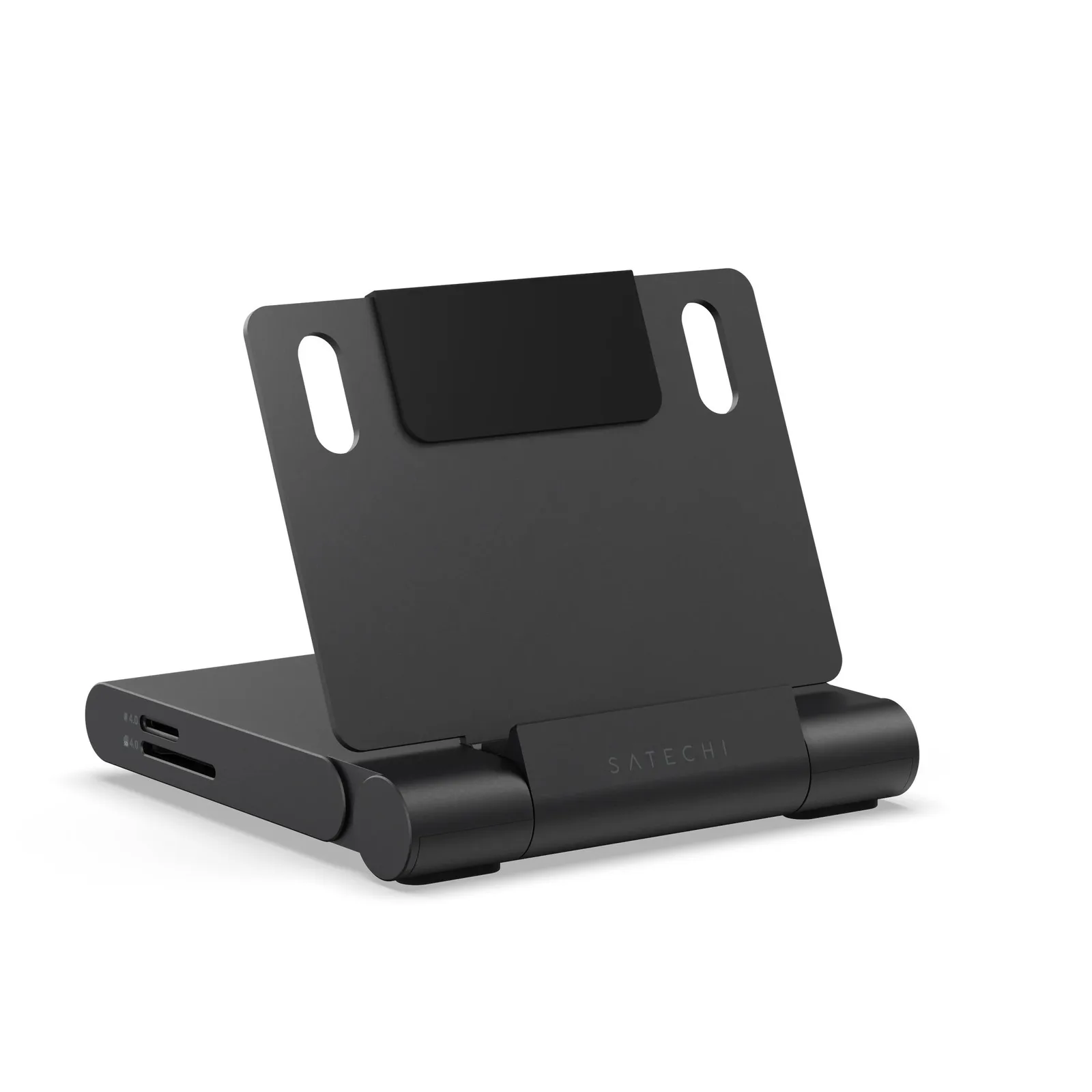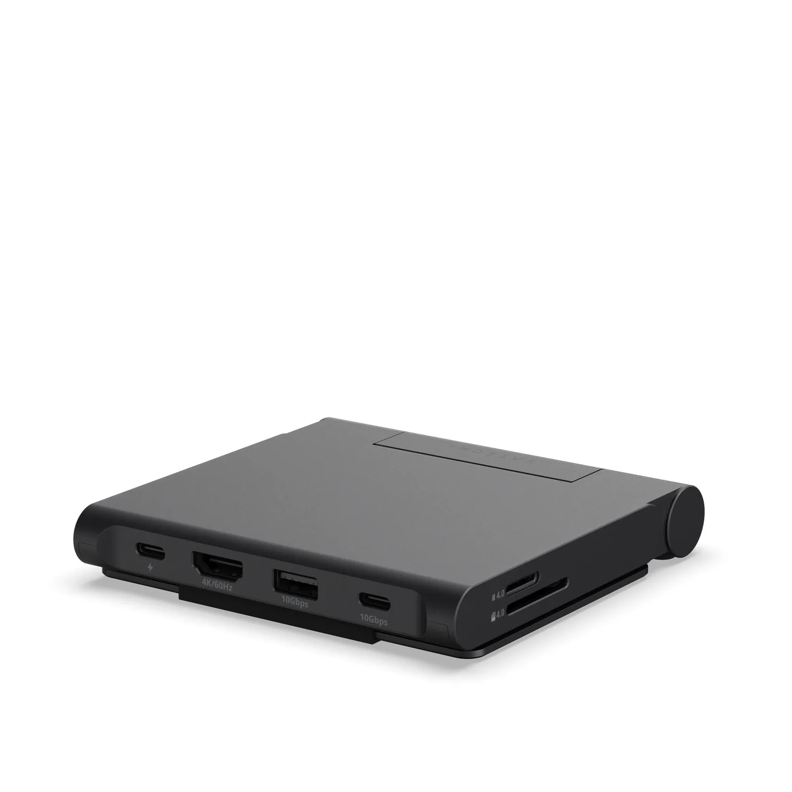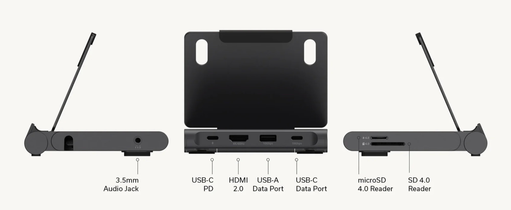Satechi 最新的扩展坞带有一个集成支架,可最大限度地提高便携性。底座可轻松折叠,方便放在上衣口袋或背包里。底座可将智能手机或平板电脑竖立起来,与键盘和鼠标一起使用时,兼容的平板电脑可以舒适地用作笔记本电脑的替代品。