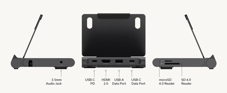 用于连接集线器的 USB-C 线缆可以收纳在设备底部,方便携带。连接后,集线器可扩展平板电脑的连接选项,包括两个 USB-C 端口,其中一个还可用于连接电源适配器。还有一个 USB-A 端口和一个 HDMI 端口,用于连接显示器或智能电视。右侧有一个 3.5 毫米耳机插孔,左侧有一个 SD 和一个 microSD 读卡器。