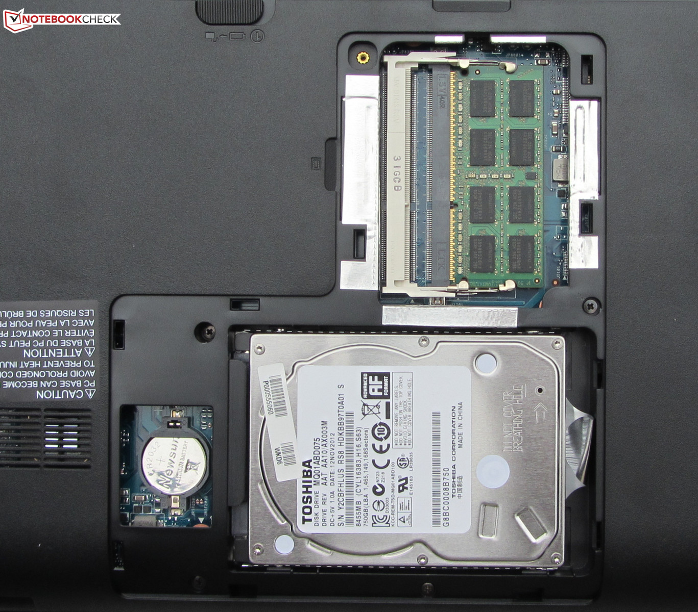 拆卸维护舱口后,用户可以访问到硬盘驱动器,内存和BIOS电池。有没有接入点的风扇。卫星C850配备两个工作记忆银行,一家银行是被占领的一个四GB的模块。据东芝网站,该器件支持高达16 GB的内存工作。硬盘驱动器可以轻松切换,驱动器可以简单地拉出。卫星上配备了一个9.5毫米笔记本硬盘。任何硬盘驱动器的连接器集成到球童,将适合在笔记本上。薄型硬盘驱动器(7毫米),当然也是一个可行的选择。