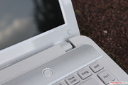 One of the main features, if that word is to be used in this context, must be the design of the subnotebook: except for its underside, our test sample is covered completely in white. The palm rest as well as the lid are also finished in a carbon fiber pattern. The display frame and large parts of the upper side of the body reflect the light, thanks to their white piano lacquer coating, which is also found on the keyboard bed. Only the frame of the trackpad glistens in a silver metallic color. All status LEDs have been placed at the front right part of the laptop.