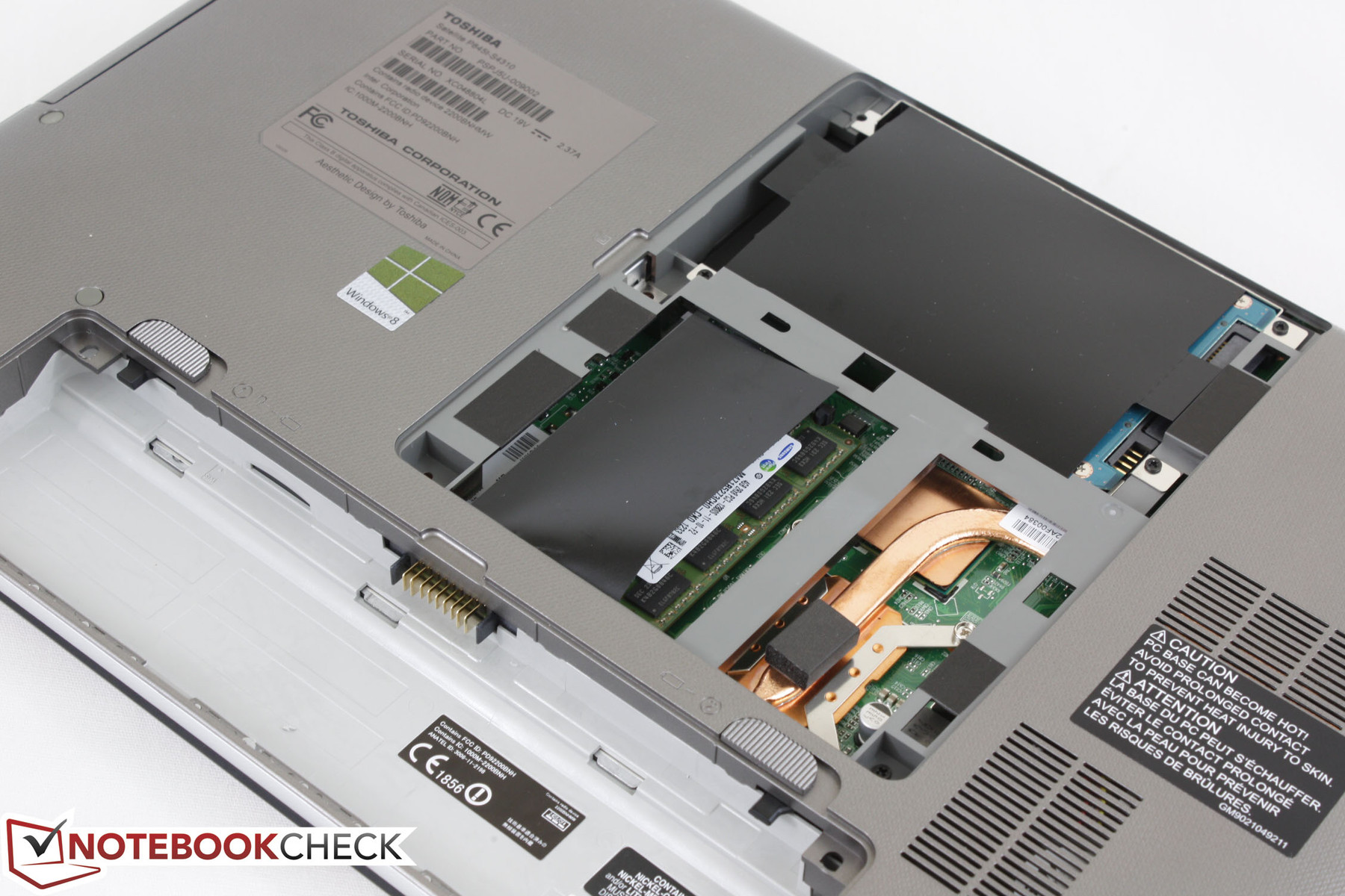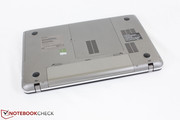 For RAM, the system makes use of 1x 4 GB module and 1x 2 GB module for a total of 6 GB of RAM. Both SODIMM modules are provided by Samsung and are easily accessible alongside the 2.5-inch HDD via a hatch underneath the notebook. Direct access to the fan, heatsink, and other motherboard components, however, will require additional dismantling.