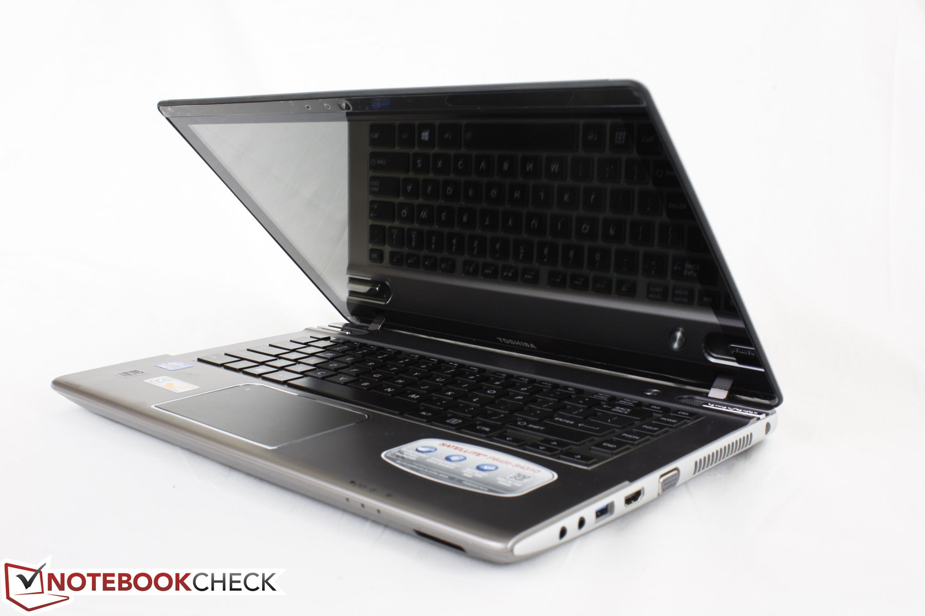 The chassis of the P845T is similar in build and appearance to its 15.6-inch version, the Satellite P855. Both the looks and texture of the notebook are unlike many other Satellite models as there is no ultra-smooth or reflective sheen on the surfaces outside of the inner glossy display. Instead, the silver surfaces of the case are textured with small bumps that diffuse glare, reduce fingerprints and give it a more affable style than the usual cookie-cutter budget cases.