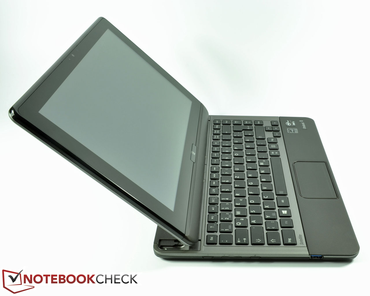 TThe Toshiba Satellite U920t-100 looks like a somewhat thick 12.5-inch tablet in the closed state. The 20 mm (~0.79 inch) thickness of our test model is 2 mm (~0.08 inches) thicker than the Sony Vaio Duo 11 but lies slightly below the Dell XPS 12 Convertible (23 mm/~0.91 inches). The measurements do not say much as all three models are easy to handle. Still, the Toshiba Satellite U920t-100 (1.5 kg/~3.3 pounds) weighs significantly more than the Sony Vaio Duo 11, but once again, it falls short of the 12.5-inch Dell XPS 12. All-in-all, the closed Satellite U920t-100 does not seem heavy. The two-color side view and rounded corners slim the hybrid down and give it a nice appeal. Once the device is opened from tablet mode, the user finds a small hand-rest region made of synthetic material which contains a small touchpad. The backlit keyboard is placed above in an anthracite-colored base made of synthetic material. The keyboard gives way under pressure, especially near the middle and the display cover also has similar issues.
