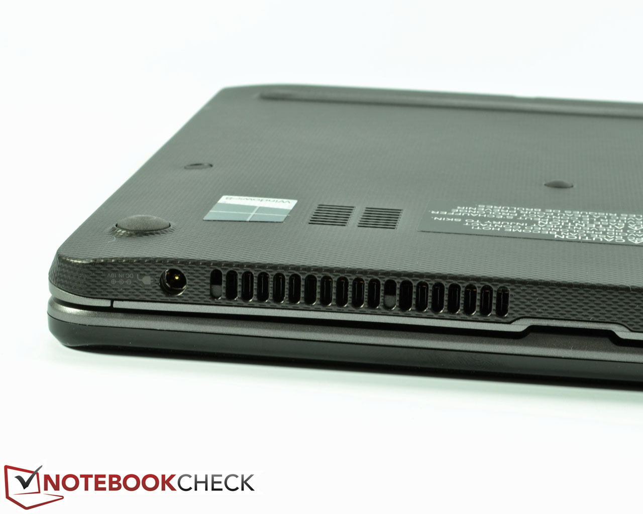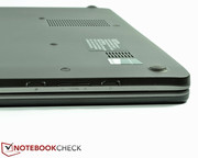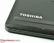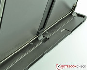 The bottom of the hybrid is made of rubber synthetic material which offers a good grip, which is useful when using the device in tablet mode. The rubber feet grant the device a good grip on the table while in notebook mode. The bottom is also susceptible to pressure, especially near the ventilation opening or the SD card slot. The manufacturer promises that the slide mechanism is reliable and long-lasting. We can confirm this assertion from our test, but the model cannot claim to have the sturdiness of a unibody case. Still, the seemingly fragile slide construction from Toshiba proves to be robust.