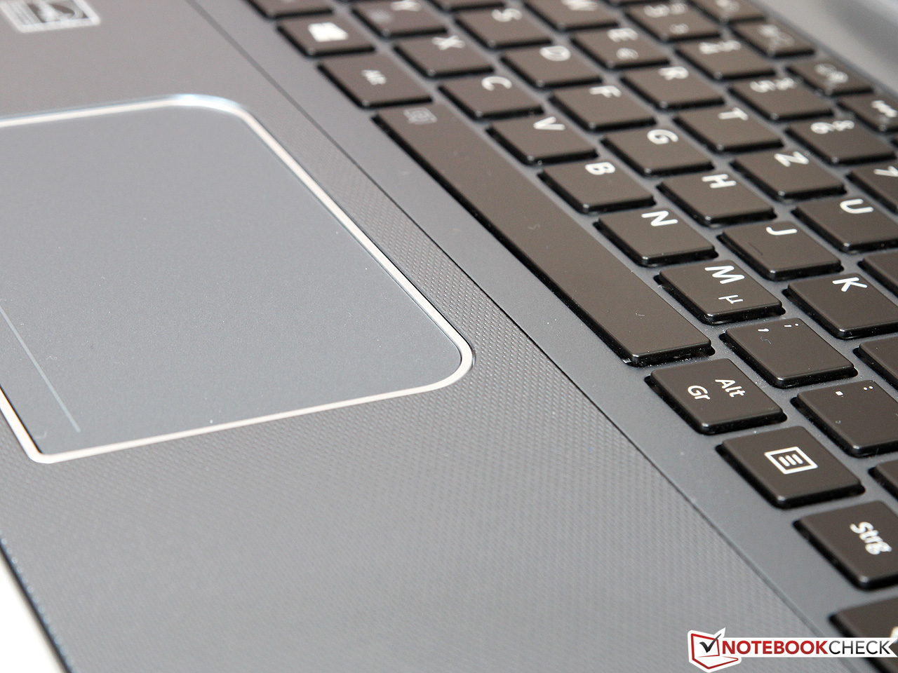 The 10 x 6.5 cm touchpad stems from Synaptics and supports many multi touch gestures with up to four fingers. The smooth surface features excellent gliding traits and precisely reacts to user input without delays. If you dislike arbitrary movements of the mouse pointer while typing, you can simply deactivate the touchpad by pressing F5.