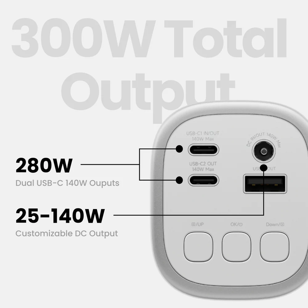 Sharge 的新款 Shargeek 300 电源之所以得名,是因为它的四个端口能够提供 300W 的最大综合输出功率。它有两个 140W USB-C 端口,可同时为两台笔记本电脑充电。此外还有一个 USB-A 端口和高达 140W 的直流输出。此外,它还支持 PD 3.1 快速充电协议。