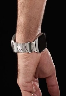 表带有三种款式:银色或黑色不锈钢表带,或灰色钛金属表带。顶部链节上有一个几乎看不见的快速释放扣,只需轻轻一动即可打开表带。表带的长度可以通过附带的工具进行调节。根据材质和长度的不同,表带的重量在 60 至 100 克之间,相当沉重。如果需要,第二块手表可以用传统表扣代替。