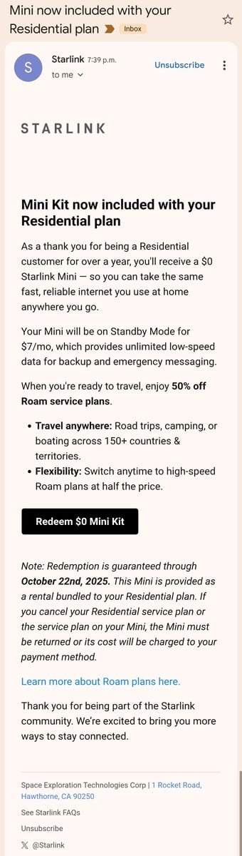 幸运的住宅用户如果在收到了这封邮件就能免费获得 Starlink Mini 碟片。您只需点击电子邮件中的 "兑换 0 美元迷你套装 "按钮,确认订单,碟形天线就会送到您的地址。SpaceX 指出,兑换链接有效期至 10 月 22 日。此外,邮件中还提到用户将获得漫游计划的 50%折扣,这意味着你只需为漫游无限计划支付 82.5 美元,为迷你漫游计划支付 25 美元。通常,这些计划的价格分别为 165 美元和 50 美元。目前尚不清楚该折扣价是只在服务的前几个月有效,还是对符合条件的住宅用户的永久性优惠。