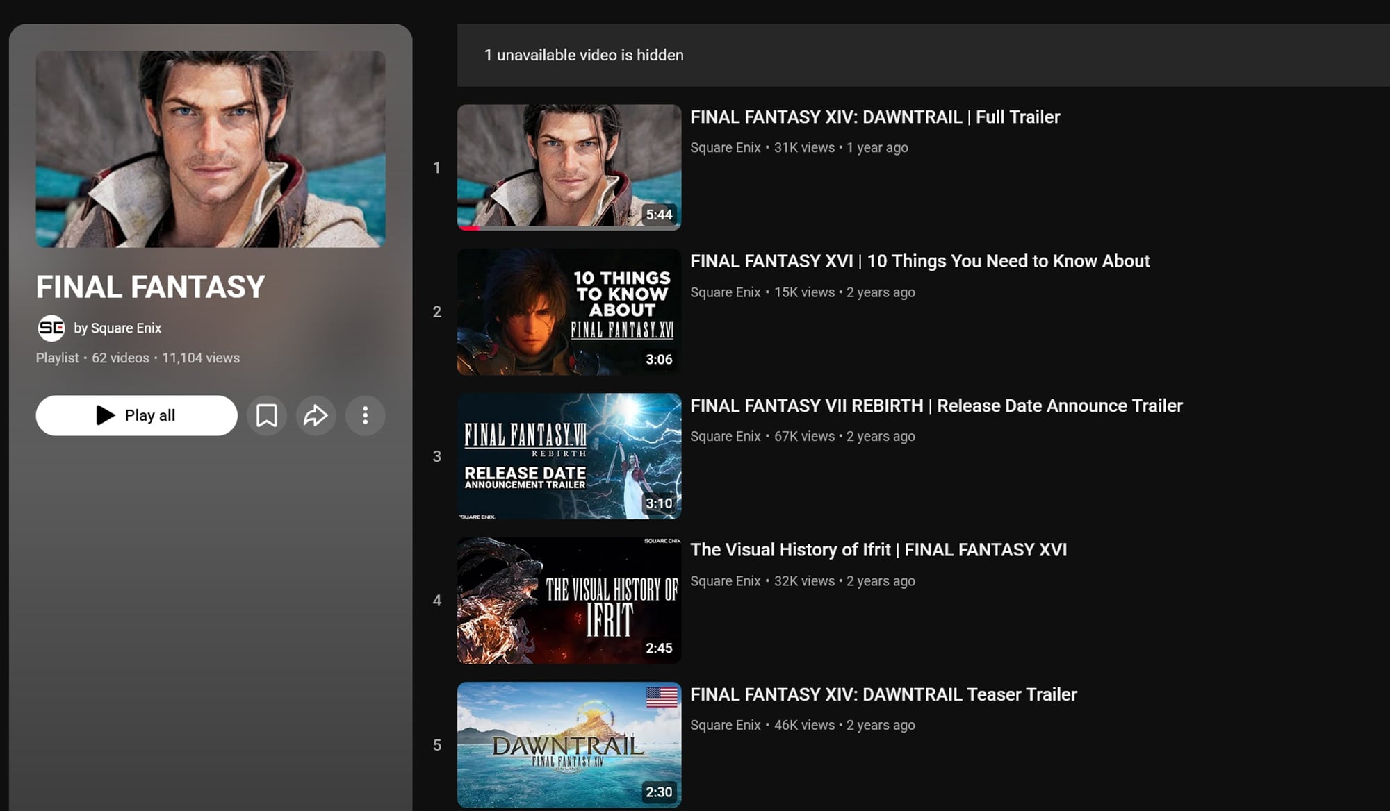 YouTube 播放列表展示了宣传热门 RPG 系列主要新作的预告片。最终幻想 14:黎明轨迹》扩充版的视频是上一个新选集,发布于 2024 年。出版商通常会提前准备好内容,但在揭晓之前不会将媒体公布于众。尽管如此,玩家们还是从 Rockstar 那里看到过类似的私人条目,但并没有产生新的 GTA 6》预告片.