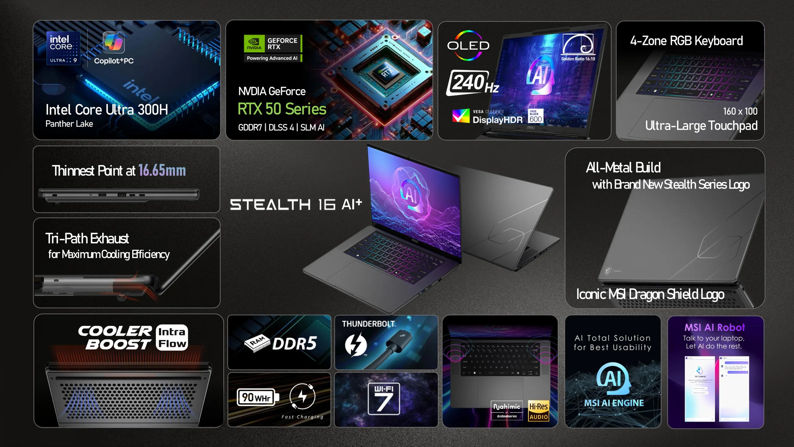今年的 Stealth 16 AI+ 也更加轻薄,重量为 1.9 千克(之前为 2.1 千克),尺寸为 354 x 246 x 16.65-19.9 毫米(之前为 356 x 260 x 19.9 毫米)。微星因此引入了全新的 Cooler Boost Intra Flow 冷却系统,该系统具有多向排气功能,据称可以在薄机箱中实现更强的冷却能力,同时使系统功率提高 20%。