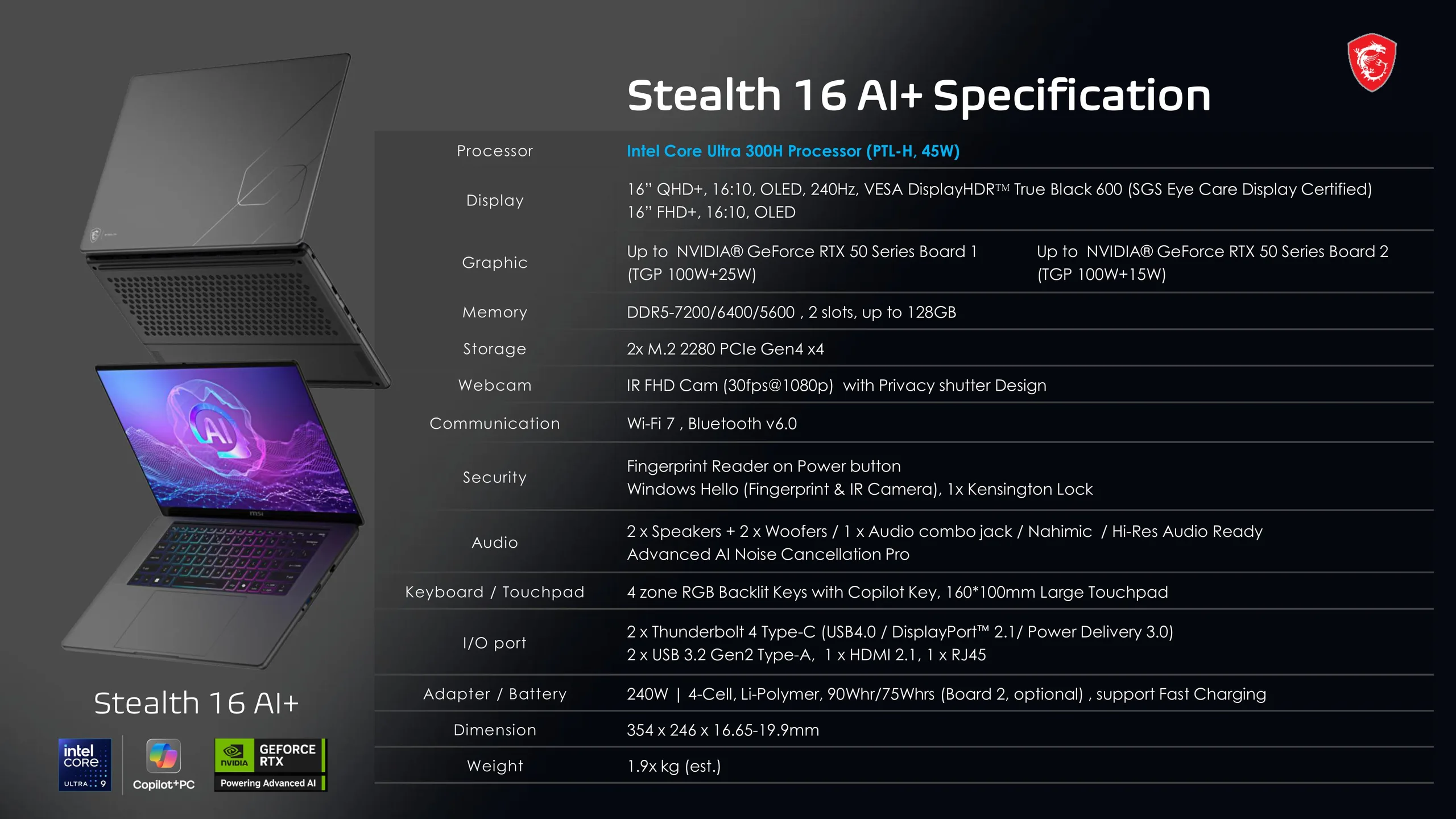 买家可为 Stealth 16 AI+ 配置高达 128 GB 的 DDR5-5600/6400/7200 内存和 2x M.2 NVMe PCIe Gen 4 硬盘。此外,Stealth 16 AI+ 还配备了带隐私快门的 FHD 红外网络摄像头、电源按钮上的指纹识别器、Wi-Fi 7、蓝牙 6、四扬声器和带 160 x 100 毫米触摸板的 4 区 RGB 键盘。