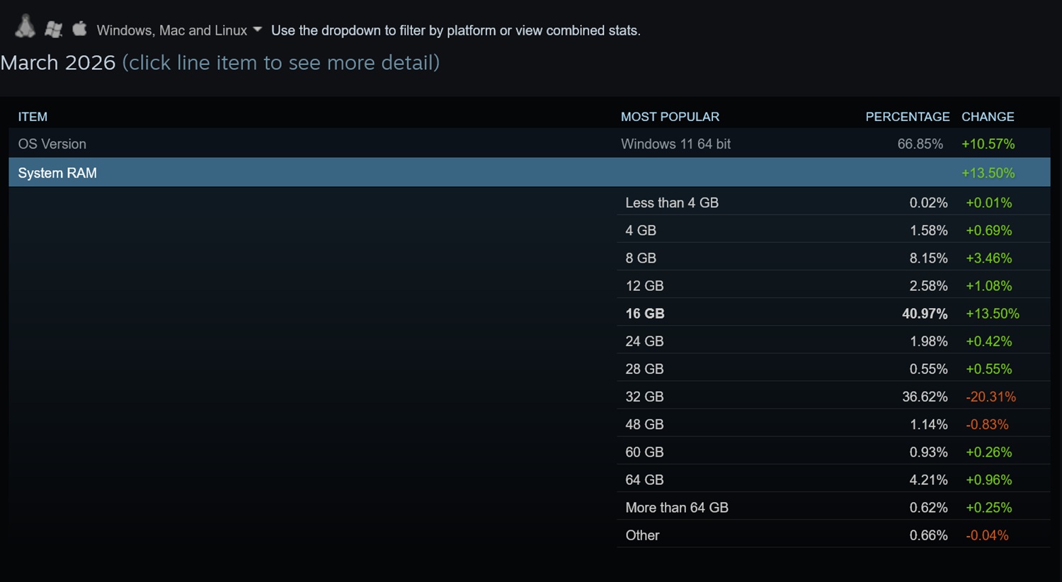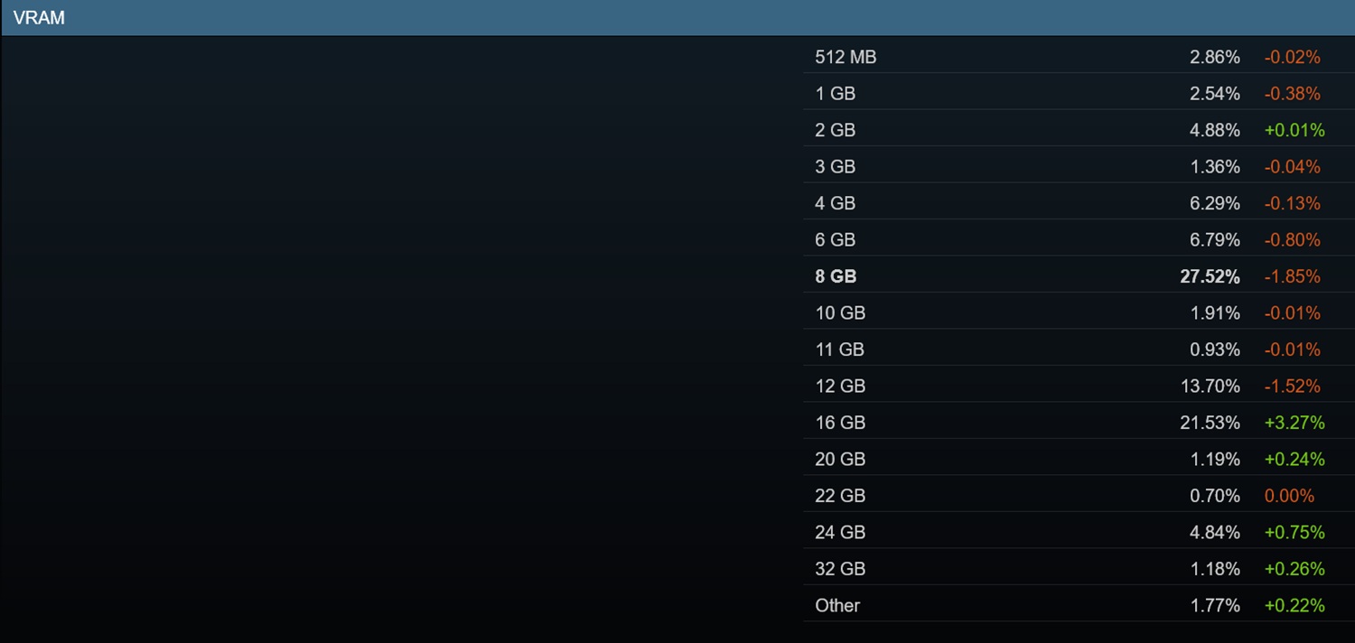 每个月,Valve 都会公布其数量惊人的玩家中最受欢迎的硬件配置。 数量惊人的玩家.其中一个明显的变化出现在系统内存类别中。与上次报告相比,32 GB 内存容量下降了 20.31%。与此同时,配备 16GB 内存模块的电脑受欢迎程度上升了 13.50%。