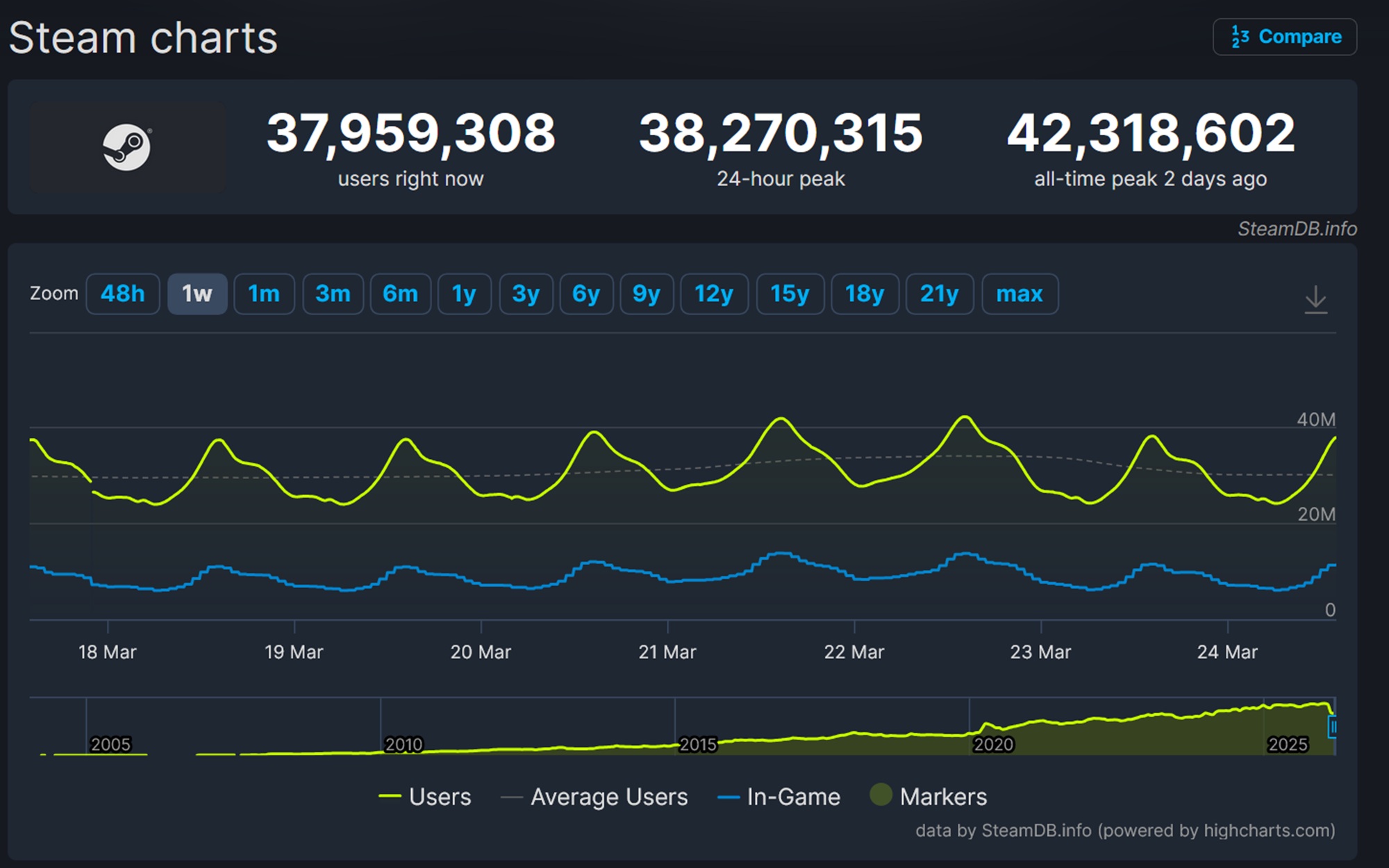 虽然 玩家数量往往最受关注,但Steam Charts和SteamDB衡量其他指标。并发用户数量显示了有多少玩家登录到 Valve 的客户端,即使他们并没有沉浸在游戏中。他们可能在浏览商店或使用 社区功能让粉丝们参与到生态系统中。