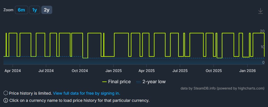 最后,尽管有 75% 的折扣,但根据SteamDB 的数据,其价格在去年下降了数倍。.值得注意的是,它的最低价格是 2023 年 6 月的 3.99 美元,相当于 80% 的折扣。