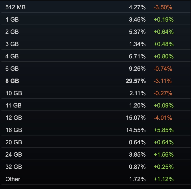 例如,2026 年 1 月结果显示,高达 29.57% 的游戏设备配备了 8GB 的 VRAM,这看起来确实是一个相当大的数字。遗憾的是,Steam 并没有说明 Bug 对报告数据的影响程度。
