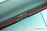 The first thing we noticed about the Fujitsu Stylistic M532 is that it is very light and has subtle color accents. The 10.1-inch tablet’s light-weight impression was confirmed by our scale which measured a 560 gram (1.2 pound) weight matching the listed specification. This places the Stylistic M532 in the company of light-weight members of the 10-inch category. With a thickness of only 8.6 millimeters (0.34 inches), the tablet can legitimately be called “ultra-slim”. A continuous aluminum rim lines the device’s edge and provides a welcome highlight with its copper-red color. The front surface is covered by a layer of scratch-resistant Corning Gorilla Glass. A rubber coating on the device’s back side provides a non-slip surface. The slightly-rounded corners combine with the front and rear surfaces to provide a high-end, pleasant feel. Overall, the tablet is stylish and modern while remaining suitable for business, at least from the outside.