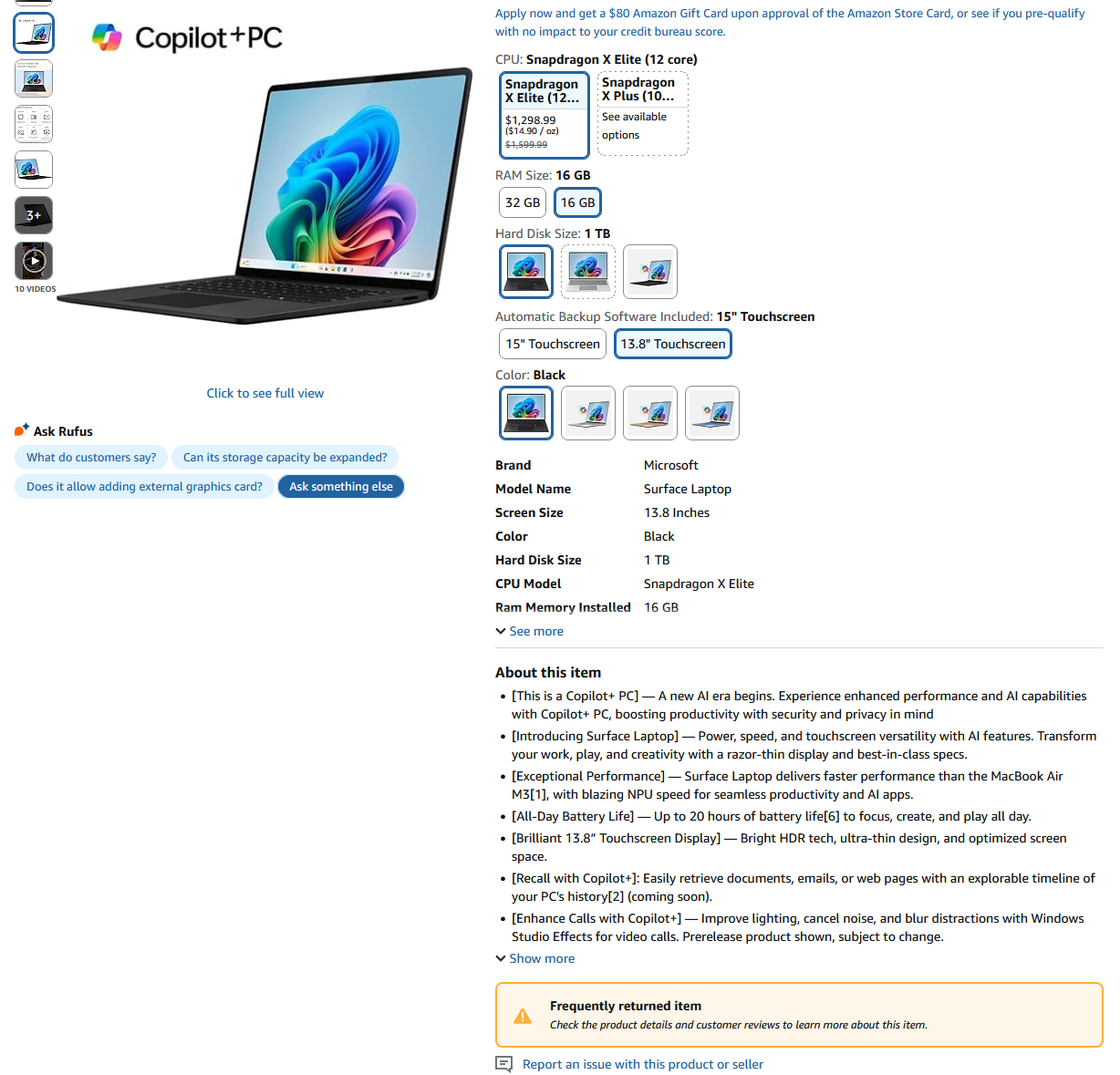 去年,英特尔公司的一位高管对搭载高通公司骁龙 X 芯片的笔记本电脑发表了有争议的言论。她说,这些笔记本电脑 "存在 高返修率"后来高通公司对此予以驳斥。然而,亚马逊上最近发布的 微软 Surface Laptop 7表明英特尔的说法有一定道理。