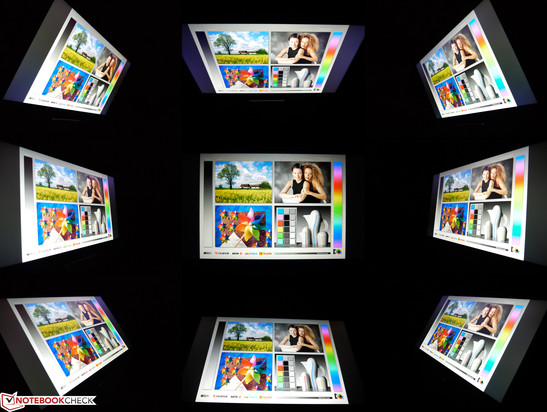 The brightness of the Samsung panel was measured at nine different places on the display. The lower left corner is the darkest with a brightness of 337 cd/m², while the brightest area is at the center of the screen with a read of 371 cd/m². The varying levels of brightness cannot be recognized even with monochrome images. On average, the display reaches a maximum of 355 cd/m² while the illumination distribution lay at 91 percent. Since brightness can only be adjusted with a sliding controller, it is difficult to set a precise value. When the controller is set at about one third the brightness we measured was about 151 cd/m²- would suffice for use indoors with a matte display in most cases. In order to trump the reflections however, users will often have to set the brightness to a higher level.