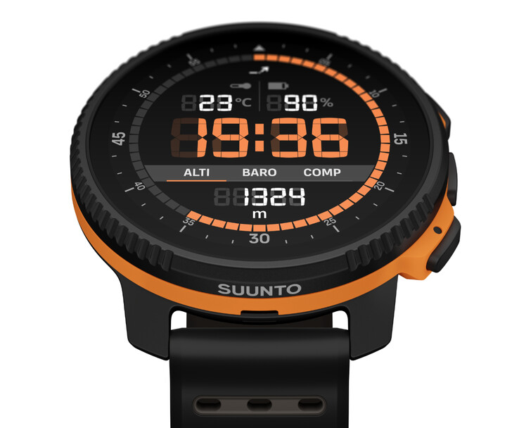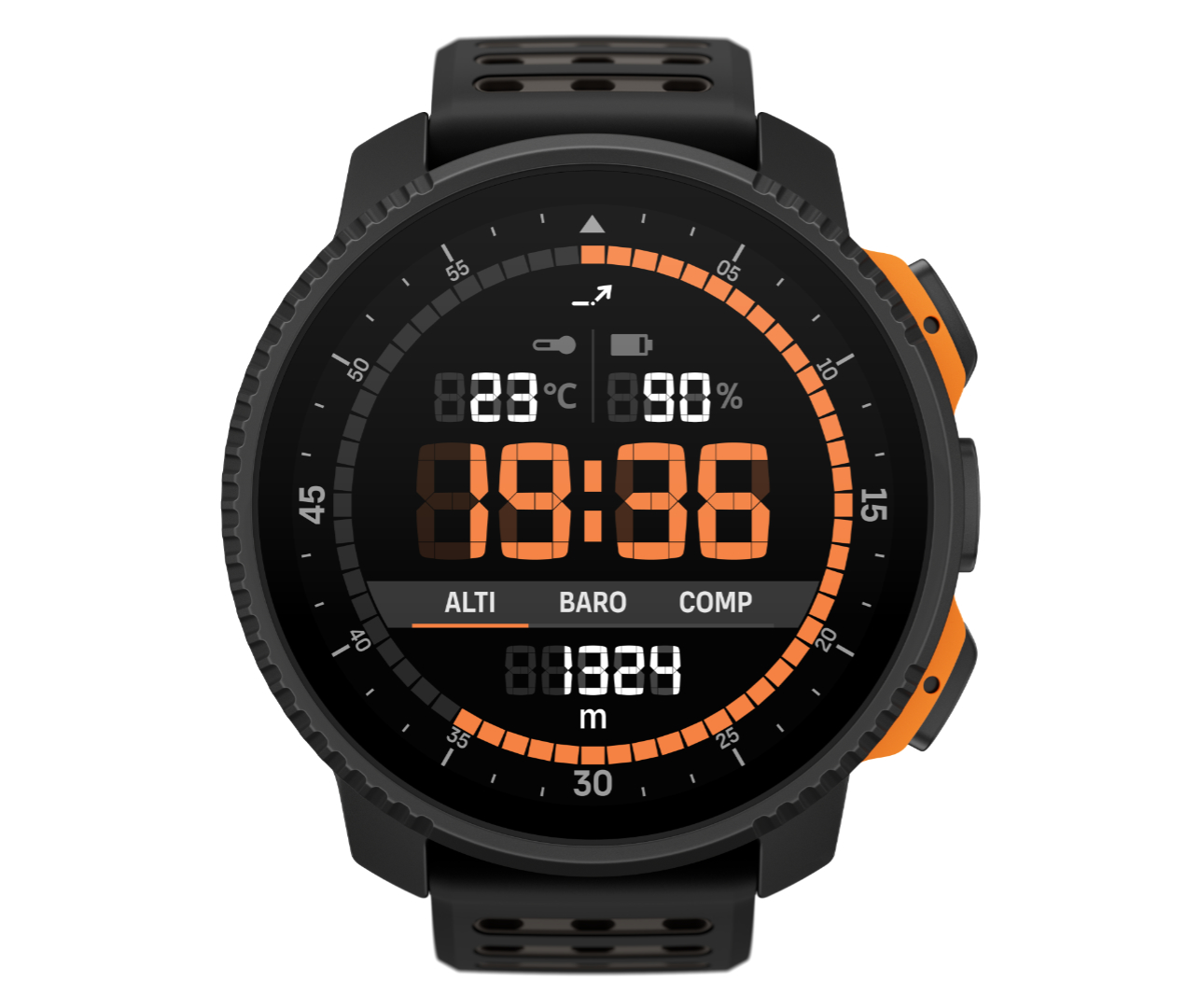 顺便提一下,Vertical 2 的新版本也只有钛金属表面。Vertical 2 Titanium 是为纪念 Suunto 成立 90 周年而设计的,据说它还从该公司的经典Vector 登山手表中汲取了灵感。.虽然 Vertical 2 Titanium 的独家表盘与橙色表壳元素相得益彰,但这一致敬之情依然不减。