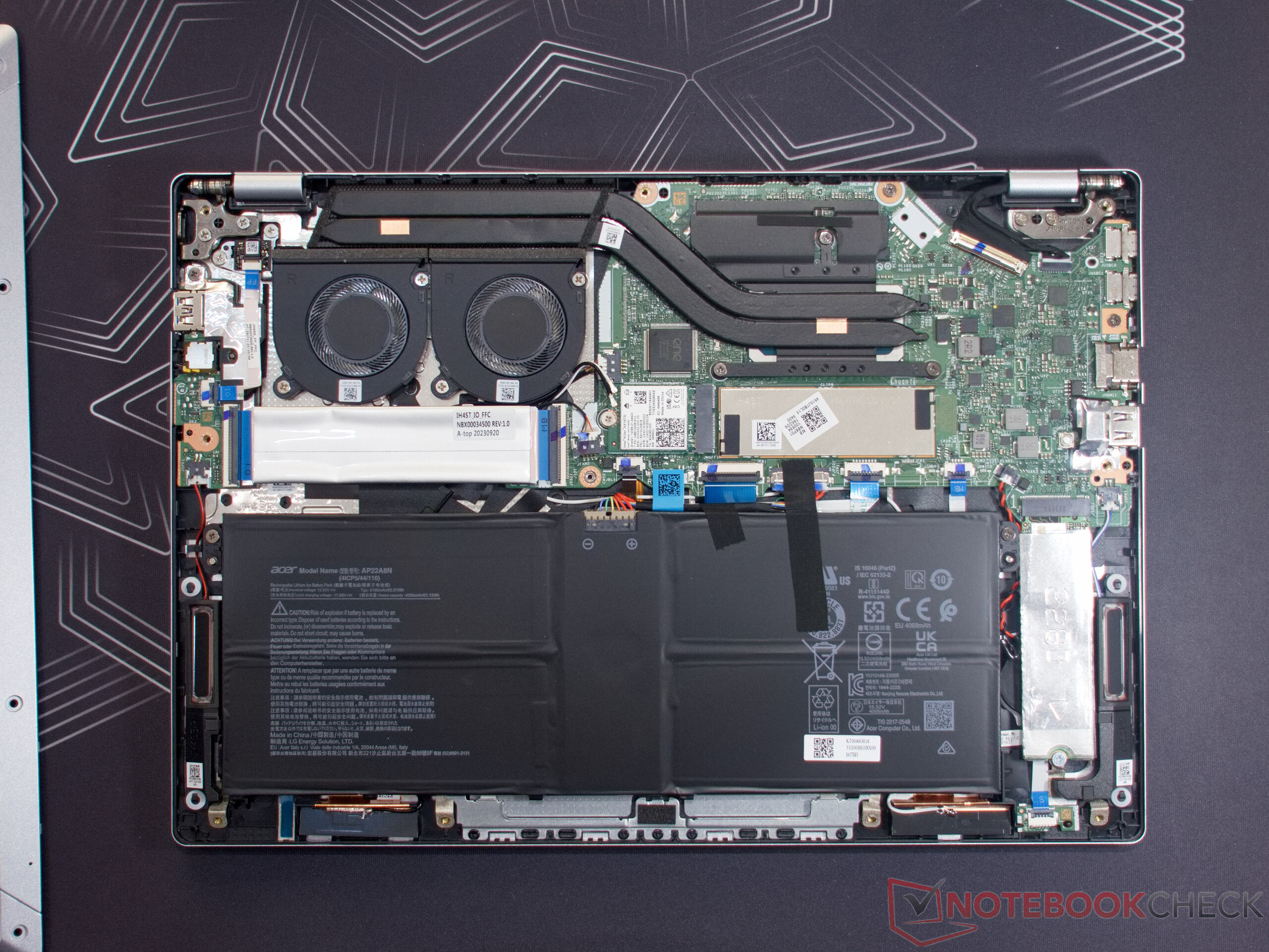 我们需要一把 TX5 螺丝刀和一个吸盘来打开宏碁 Swift Go。与 前代在笔记本电脑内部可以找到许多维护选项。两个 M.2 插槽(占用一个)和一个已安装的 Wi-Fi 模块可用。风扇可以轻松拆卸,以便清洁。只有大容量的 32 GB 内存是焊接的。顺便提一下,空闲的 M.2 插槽位于风扇旁边的带状电缆下面。