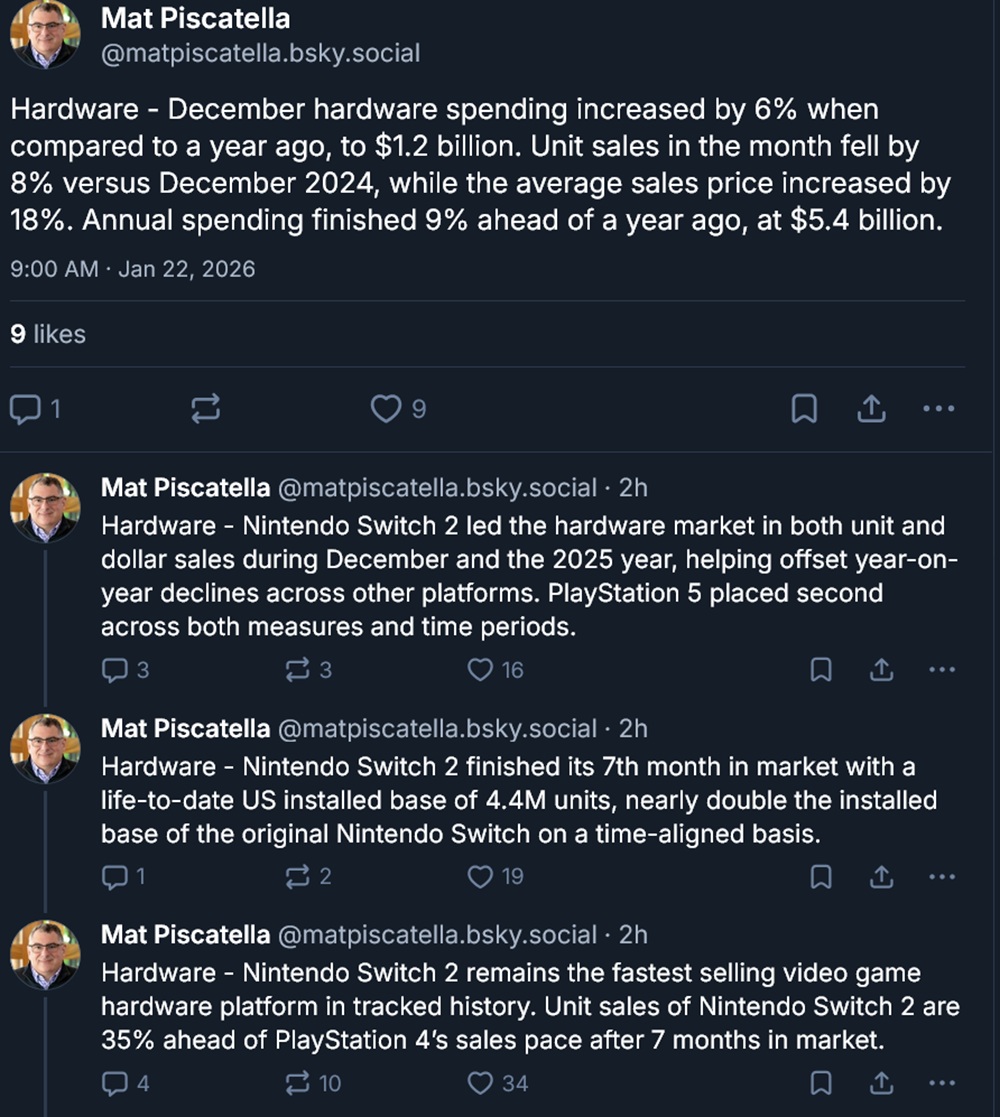 随着时间的推移 跃过了任天堂的竞争对手在包括英国和西班牙在内的几个欧洲国家。皮斯卡特拉认为,PlayStation 硬件的折扣促成了这一逆转。即便如此,在美国,索尼游戏机在 12 月和 2025 年再次位居第二。