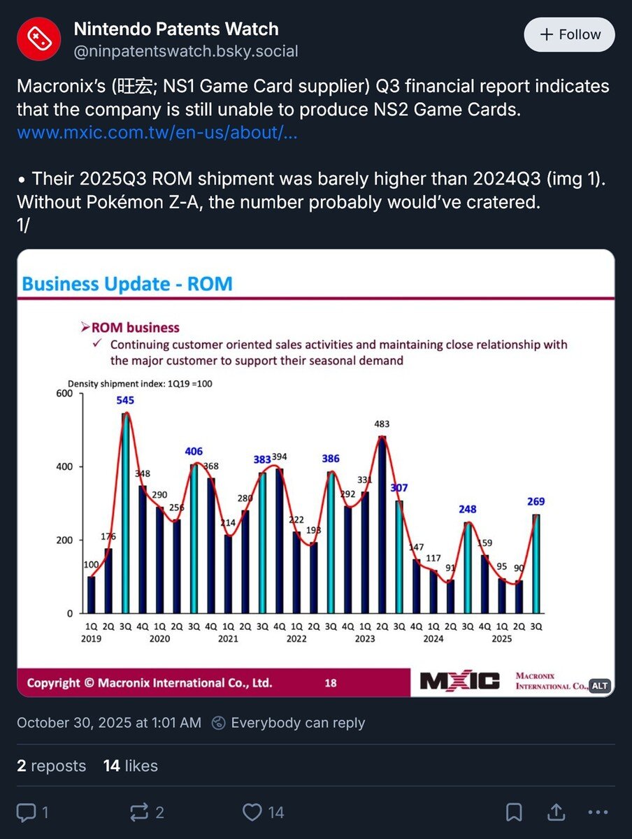 蓝天上的任天堂专利观察讨论了这家台湾公司发布的季度财务报告。旺宏董事长指出,研发延迟影响了 Switch 2 的计划。不过,该制造商确实对 2026 年的 "ROM 业务 "抱有更大的希望。