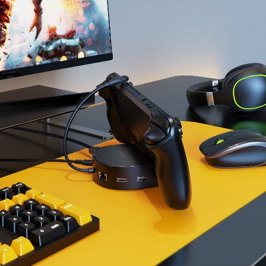 因此,6合1底座被吹捧为 "蒸汽甲板 "的理想旅行伴侣。 蒸汽甲板的理想旅行伴侣,因为它可能允许用户将其插入任何 千兆位以太网电缆和/或 4K/60Hz监视器(或 投影机他们可能遇到的情况。它甚至有一个内置的、有角度的 Type-C电缆,为控制台的顶部端口留出自己的USB输入端口,供外部存储设备、智能手机等使用。