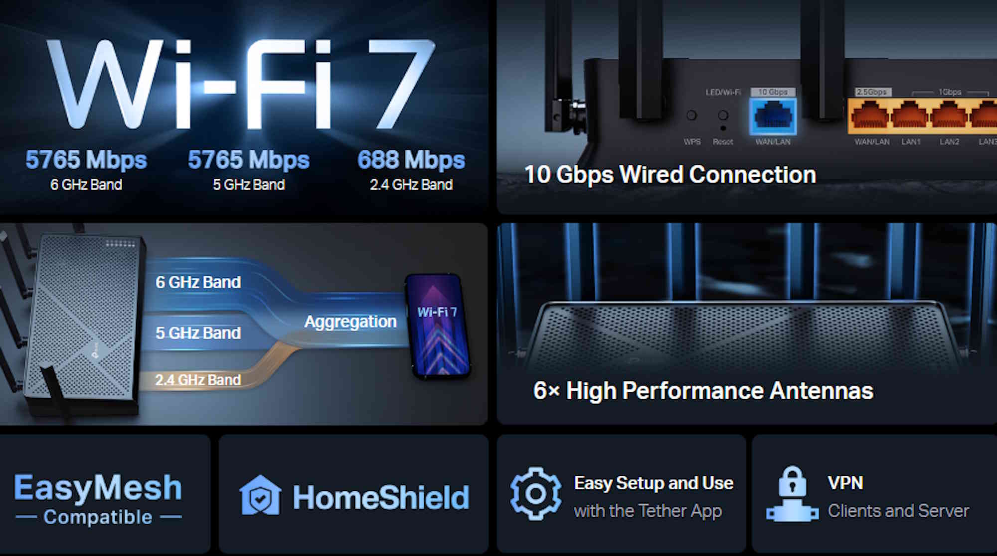 据 TP-Link 称,Archer BE670 适用于有三间卧室的大房子。为了覆盖更大的区域并提高无线速度,路由器可以通过 EasyMesh 建立网状网络。路由器配有六根外置天线和五个以太网端口,清晰可见。10 Gbps 和 2.5 Gbps 端口可分别用作 WAN 或 LAN 端口。