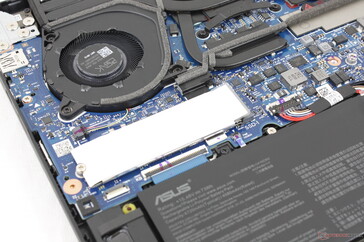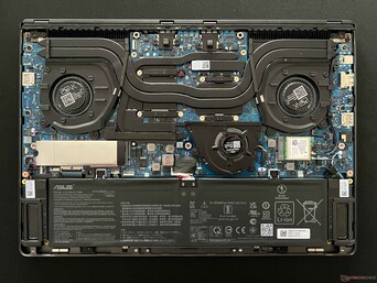底板由 11 颗十字螺丝固定,便于维修。主板布局与最近推出的 2024 Zephyrus G14主板布局与最近的 2024 Zephyrus G14 有很多相似之处,如下面的对比照片所示,但 TUF 型号省略了第三个风扇,而采用了第二个 M.2 2280 PCIe4 x4 SSD 扩展插槽,成为目前极少数支持两个全长 M.2 SSD 的 14 英寸游戏笔记本电脑之一。不过,根据我们对温度的观察,该系统很可能需要额外的冷却。