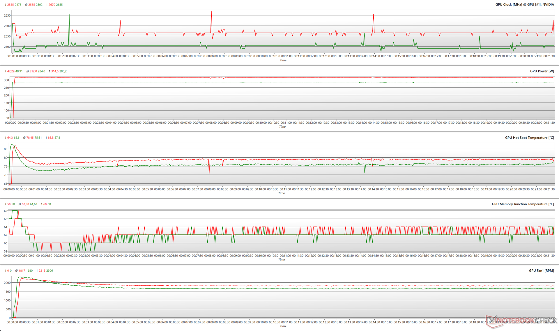 将功耗目标提高到 110%,显卡的频率可提升至 2,670 MHz,而功耗接近 315 W。这也导致平均热点温度略高,约为 78.5 °C,平均风扇转速更高,为 1,817 RPM。