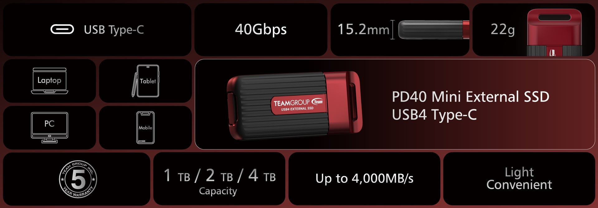Team Group 推出了一款新的便携式存储硬盘--PD40 Mini 外置固态硬盘。它配备 USB4 连接,但也兼容 USB 3.2 和 USB 2.0 设备。不过,由于采用了速度更快的 Type-C 端口,该公司声称其读取速度可达 4000 MB/s。