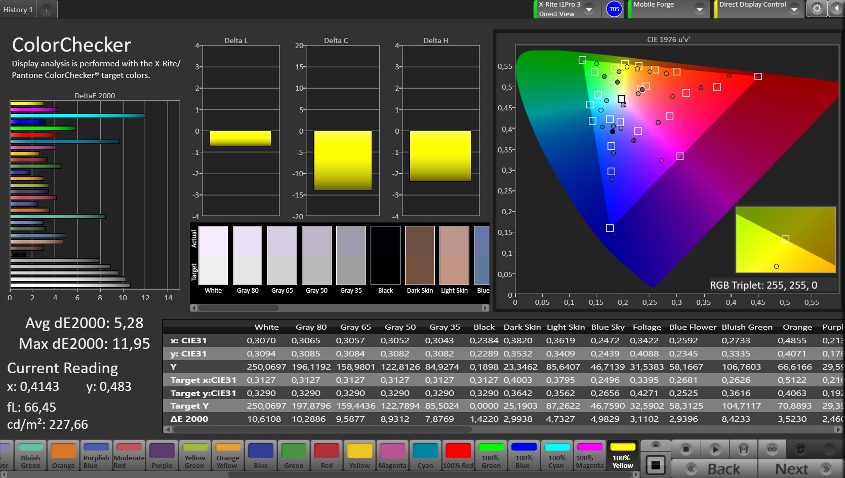 | Colorchecker dE 2000 max. * | 11.95 | 15.4 -29% | 9.25 23% | 14.4 -21% | 11.4 5% | 5.4 55% |