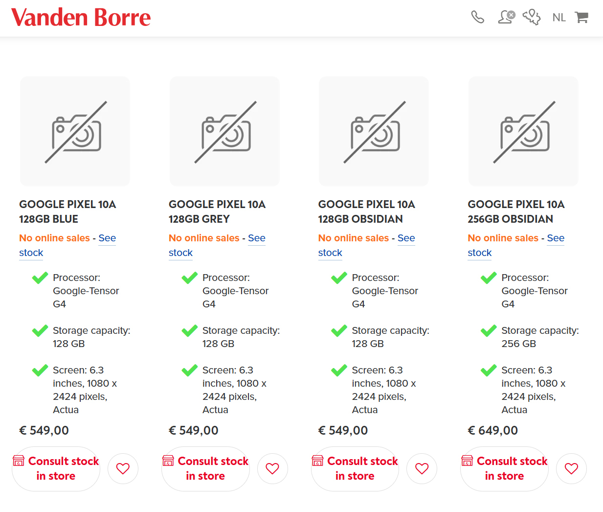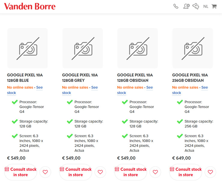 不仅如此,Vanden Borre 还透露了上市定价。目前,该零售商预计将销售蓝色、灰色和曜石色的 Pixel 10a。正如下面的截图所示,Vanden Borre 将这些颜色的产品定价为 549 欧元(约合 650 美元),存储容量为 128 GB。该零售商确认,谷歌将对 256 GB 存储空间收取 649 欧元(约合 769 美元)的价格。不过,Pixel 10a 的 256 GB 存储容量应该不止下图中的黑曜石色。