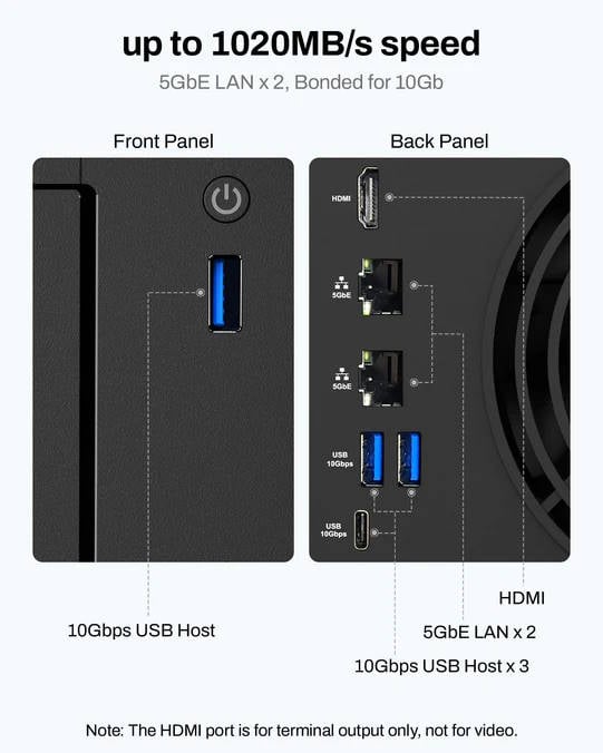 单个 HDMI 输出可用于连接外部显示器。这两款 NAS 设备都支持 Docker,允许用户运行各种应用程序。它们还提供全面的安全选项和云服务集成。后一项功能可让用户选择在本地设备和云存储上备份数据,以加强保护。